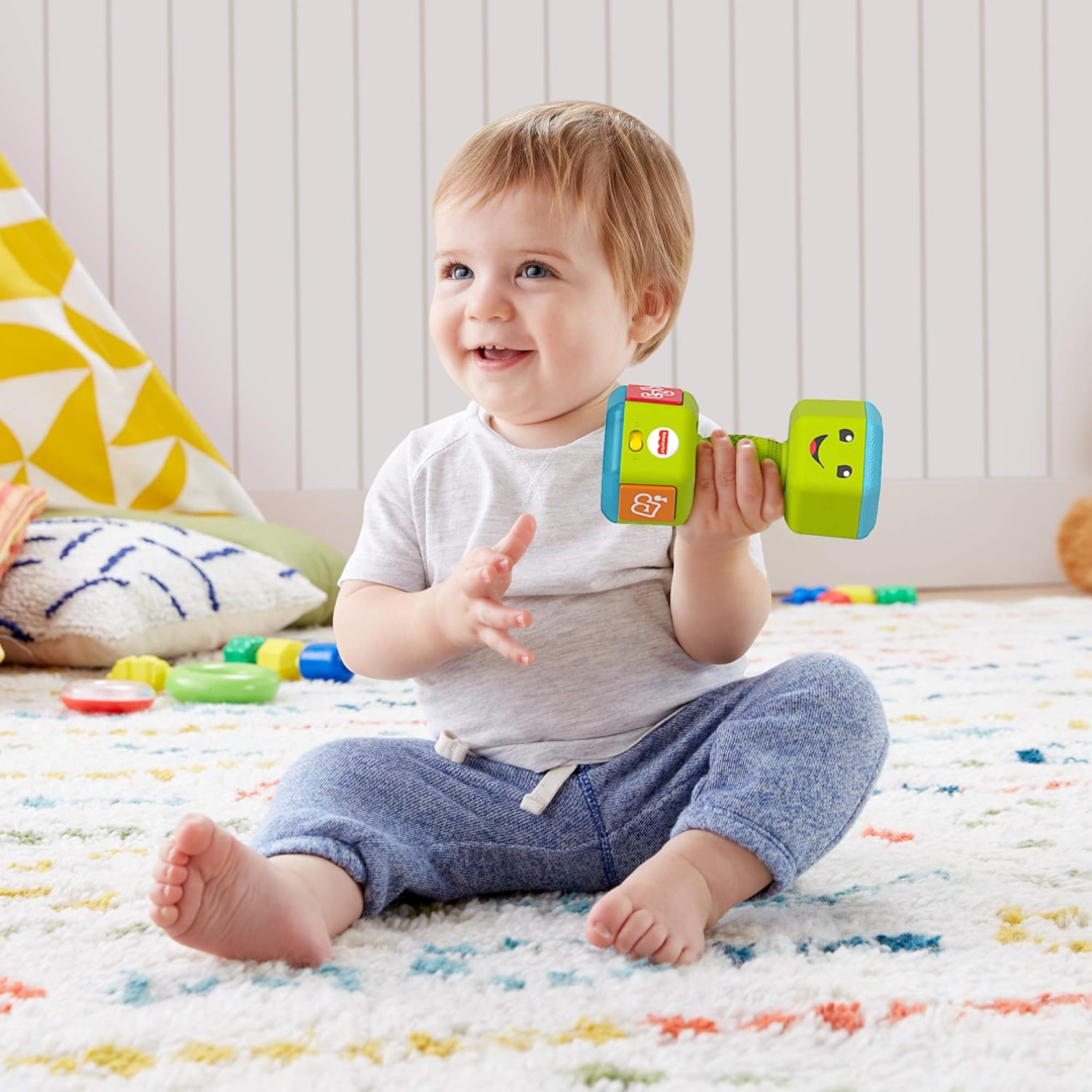 Pretend dumbbell plays fun music, sounds, and colourful lights for early role play fun Buttons activate lights, cool gym jams, and learning songs and phrases about numbers, opposites and healthy habits Motion-activated rattle weight lights up as baby “lifts” Rattle beads, fun music and colourful lights help get little bodies moving. For infants and toddlers ages 6-36 months.