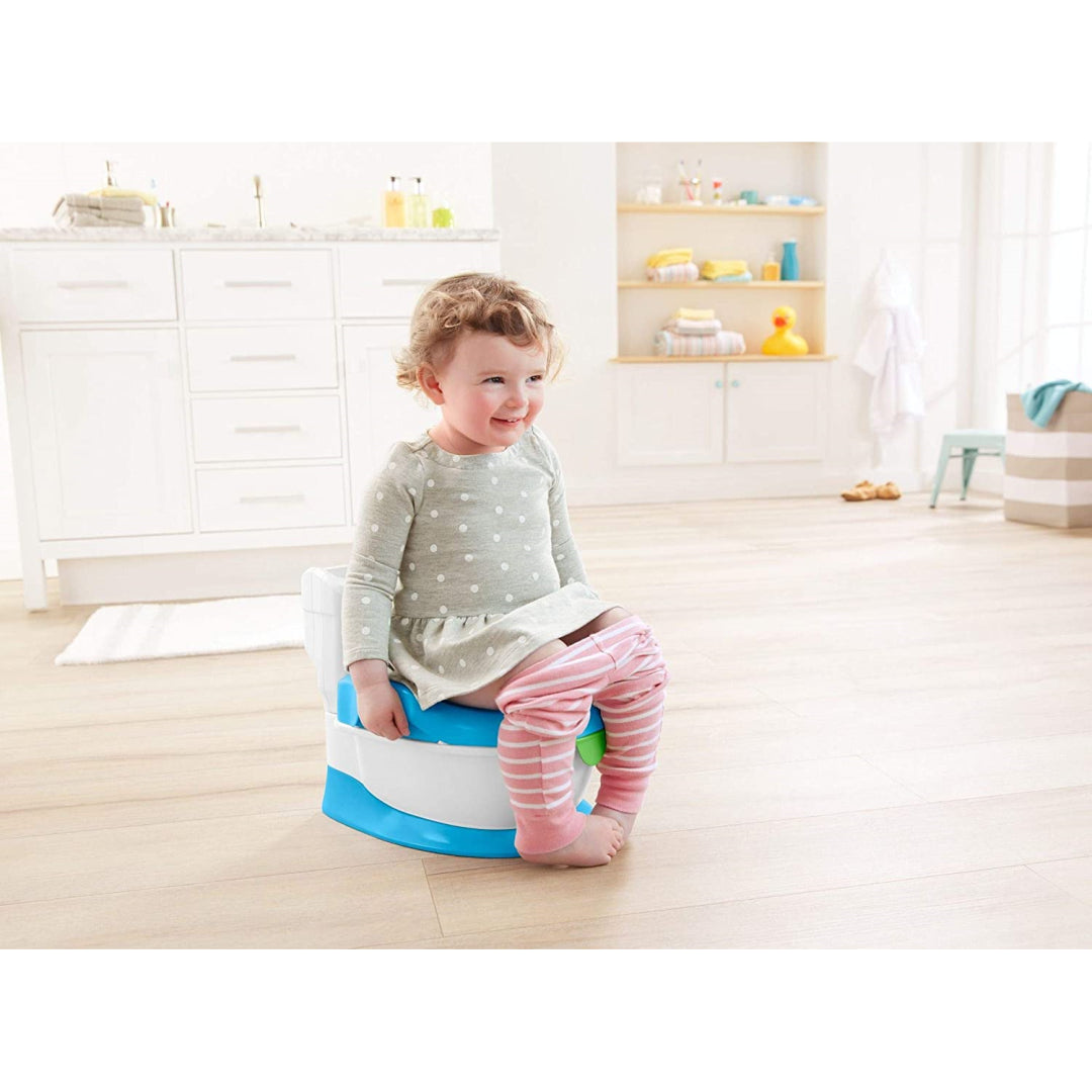 Balance and coordination are two aspects of development that come into play here: when young children learn to lower themselves onto the toilet on their own (and then get back up again!), they will improve their balance and coordination. Curiosity is a great way to keep toddlers involved in toilet time and urge them to use the potty. Realistic noises, sung tunes, and engaging words help keep toddlers focused. The low seat and high seat back make children feel safe and anchored when they are introduced to the toilet routine while sitting on the potty. This aids in toddlers' overall enjoyment while they use the potty.