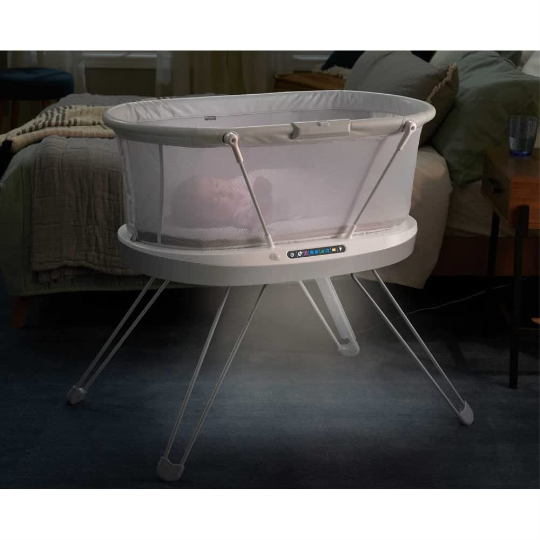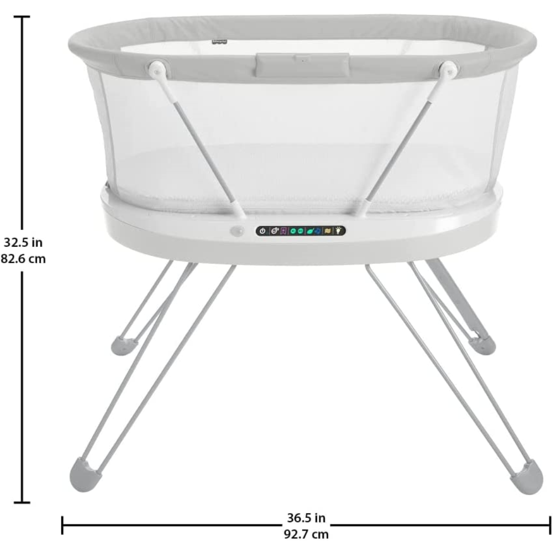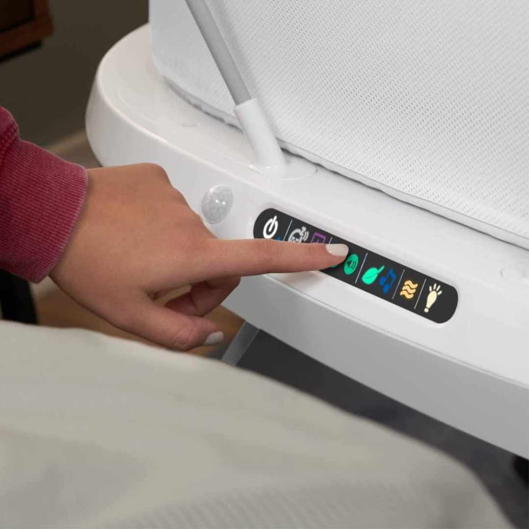 Cosy sheet and mattress pad included. The Smart Connect app lets you control sounds and vibrations, and the AC plug option saves batteries. An optional Smart Sensing System responds when baby cries.