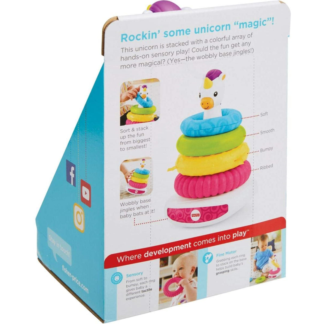 The unicorn pyramid is a magical reinterpretation of the traditional Fisher-Price stacking toy, complete with a touch of enchantment. Each brightly coloured ring has a unique texture, which baby may discover by stacking the rings as high as possible on his or her finger. While the base swings back and forth by tilting under the baby's pressure, a charming unicorn triumphs over the obstacle. Learning and development via play - Sensory abilities: due to the vivid colours, textures, and a variety of noises, this toy stimulates your baby's eye, touch, and hearing skills, allowing them to grow and develop their vision, touch, and hearing.
