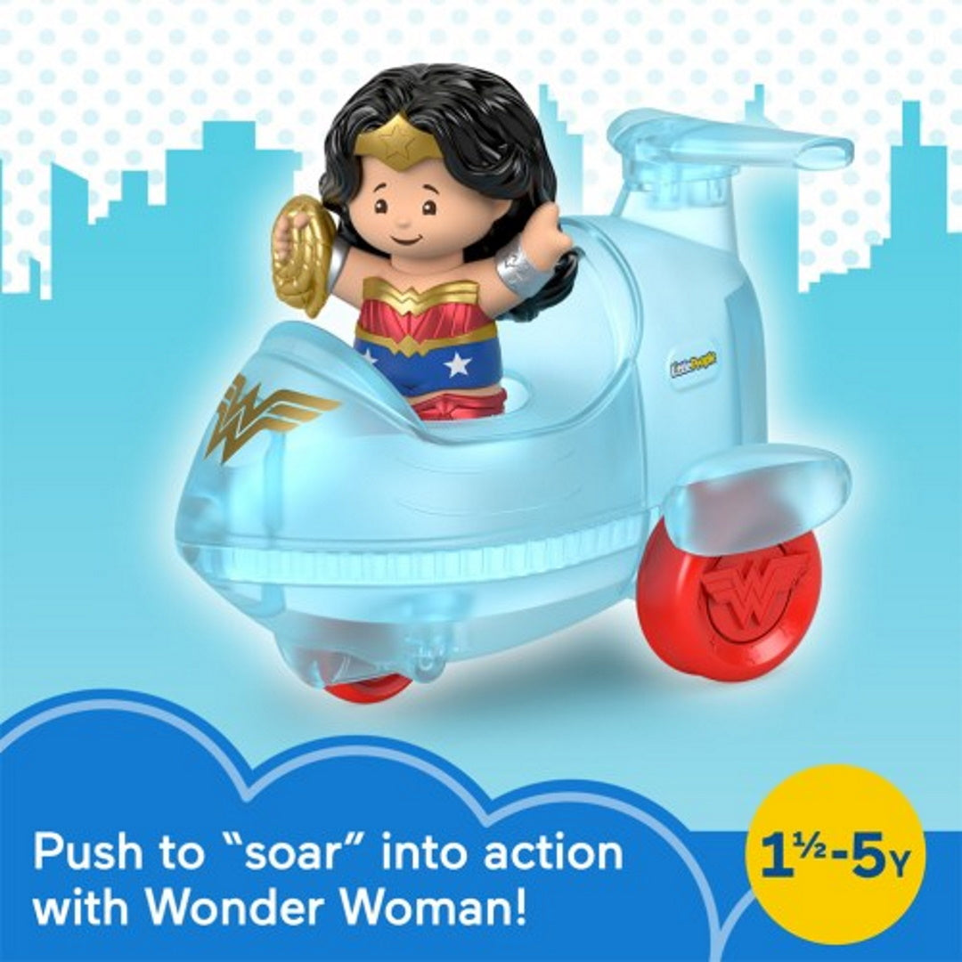 Using this Little People DC Super Friends toy plane and figure set, aspiring young heroes can take Wonder Woman "flying" all the way from their living room all the way to Themyscira. The action figure of the superhero may be loaded into the cockpit of the Invisible Jet, where younger children can then activate the toy. The strengthening of fine motor abilities, such as hand-eye coordination, is facilitated by activities such as picking up and moving toys.