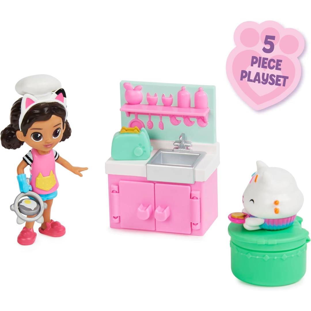 Inside you'll find a 10.2-cm Gabby Girl collectible figure, an adorable Cakey Cat figure, and a realistic kitchen sink unit with working cabinets. The special Dollhouse Delivery box adds extra excitement with a surprise kitchen accessory waiting to be discovered. Watch your child's eyes light up as they press Gabby's cat ears to flip the frying pan and create pretend culinary masterpieces.