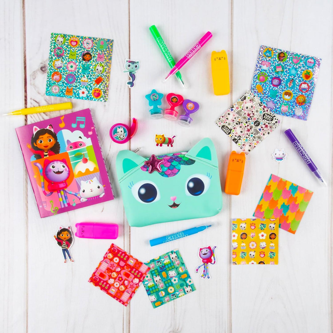 The set includes a pencil case decorated with Gabby's Dollhouse characters, keeping all those mini stationery bits neat and tidy whether it's for school or play at home. There's also a mini scrapbook inside where kids can stick, stamp, and doodle their way through pages of memories and imaginative creations.