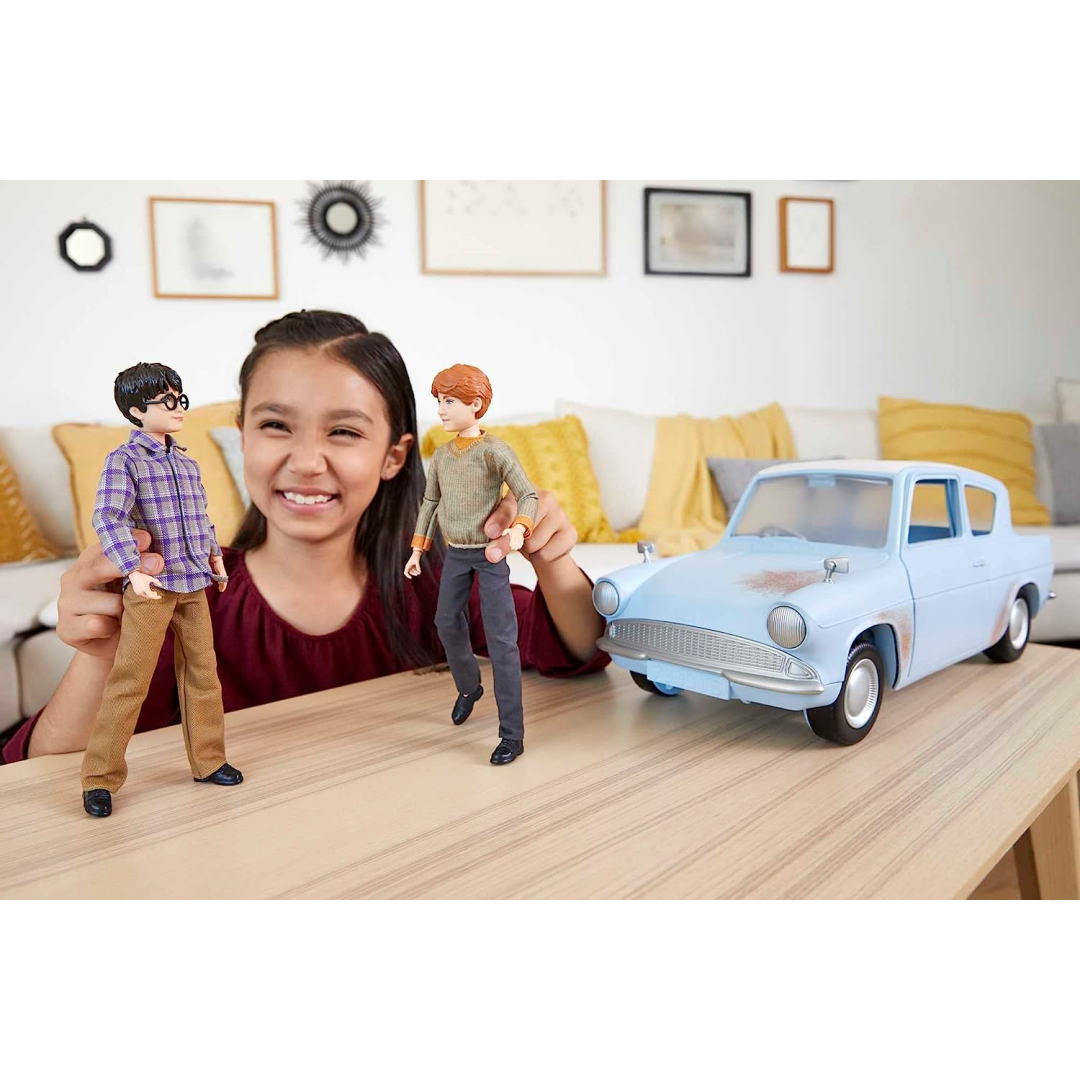 Relive an iconic movie moment with Harry & Ron's Flying Car Adventure! This collectible set features Harry Potter doll, Ron Weasley doll and a replica of the iconic Ford Anglia vehicle featured in Harry Potter and the Chamber of Secrets. Perfect for display or play, the "flying car" features a true-to-movie sculpt, realistic rust deco, working doors and seating for both dolls.
