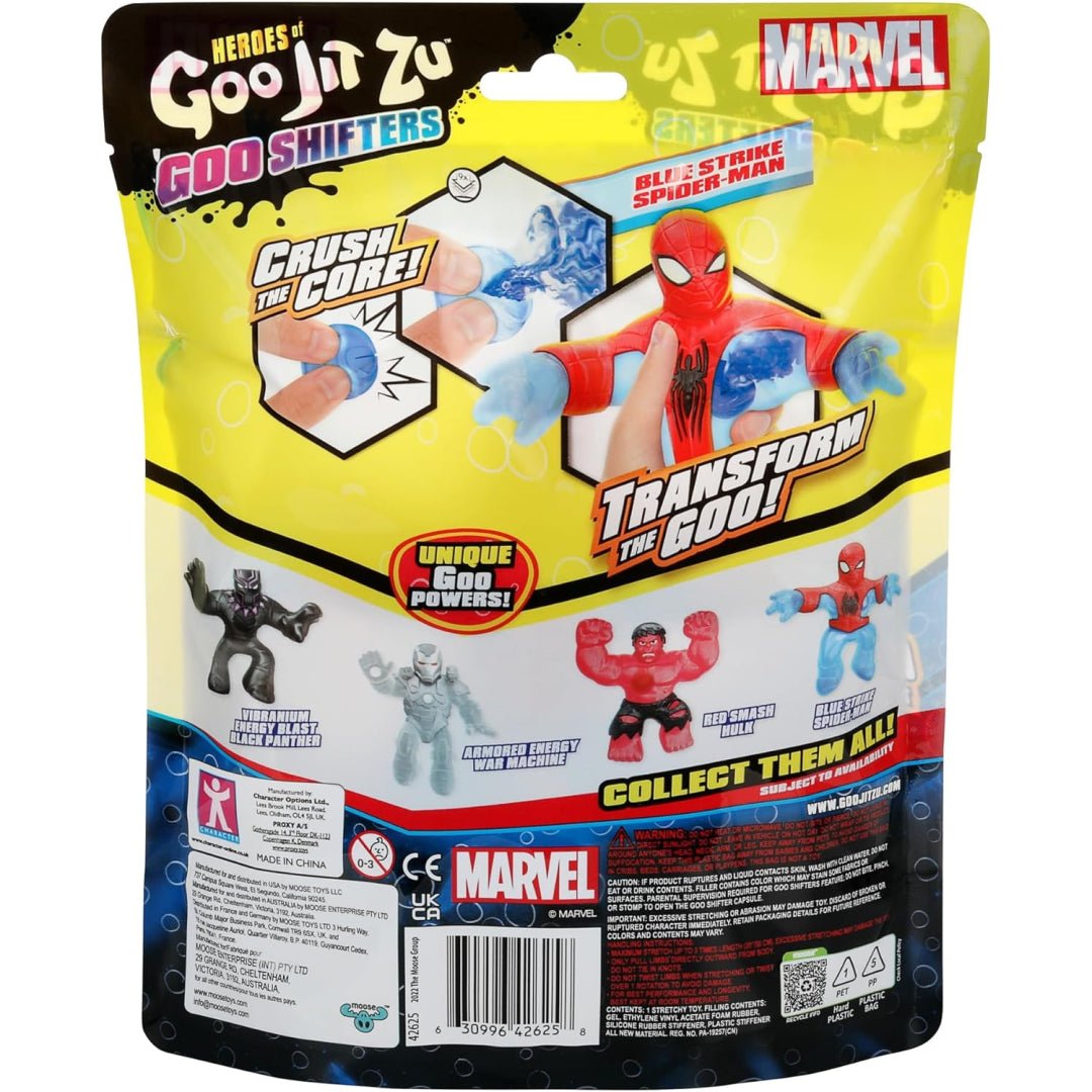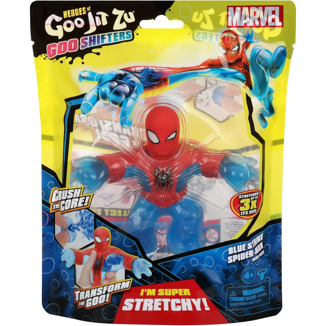 Special Fillings The Blue Strike Spider-Man is very elastic! Children will enjoy pressing and squeezing his body! Marvel-themed Goo Jit Zu Goo Shifter Heroes feature a variety of distinctive fillings. Discover extraordinarily squishy, super flexible, and super mushy bodies that enhance the personalities of each character. with inside fillings that swirl in a range of colours.