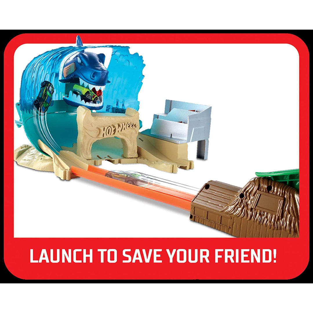 This value-packed playset features a massive shark ready to chomp unsuspecting vehicles, a cool tiki house launcher, and a motorised wave that adds amazing action to every play session. Your little racers can save trapped cars from the shark's mighty jaws, perfect their surf skills, or challenge themselves to land in the grandstands for extra points!