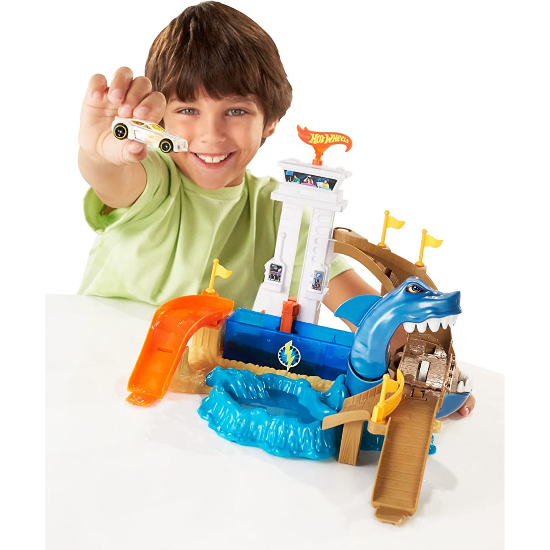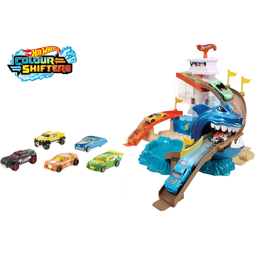 Watch as your kids master the challenge of racing from the tower's peak while dodging the menacing shark below. With just a pull of the release lever, trapped cars can break free for another round of racing fun. The set includes both a dunk tank and splash pool where the included colour-changing car magically transforms its appearance - a feature that never fails to amaze!