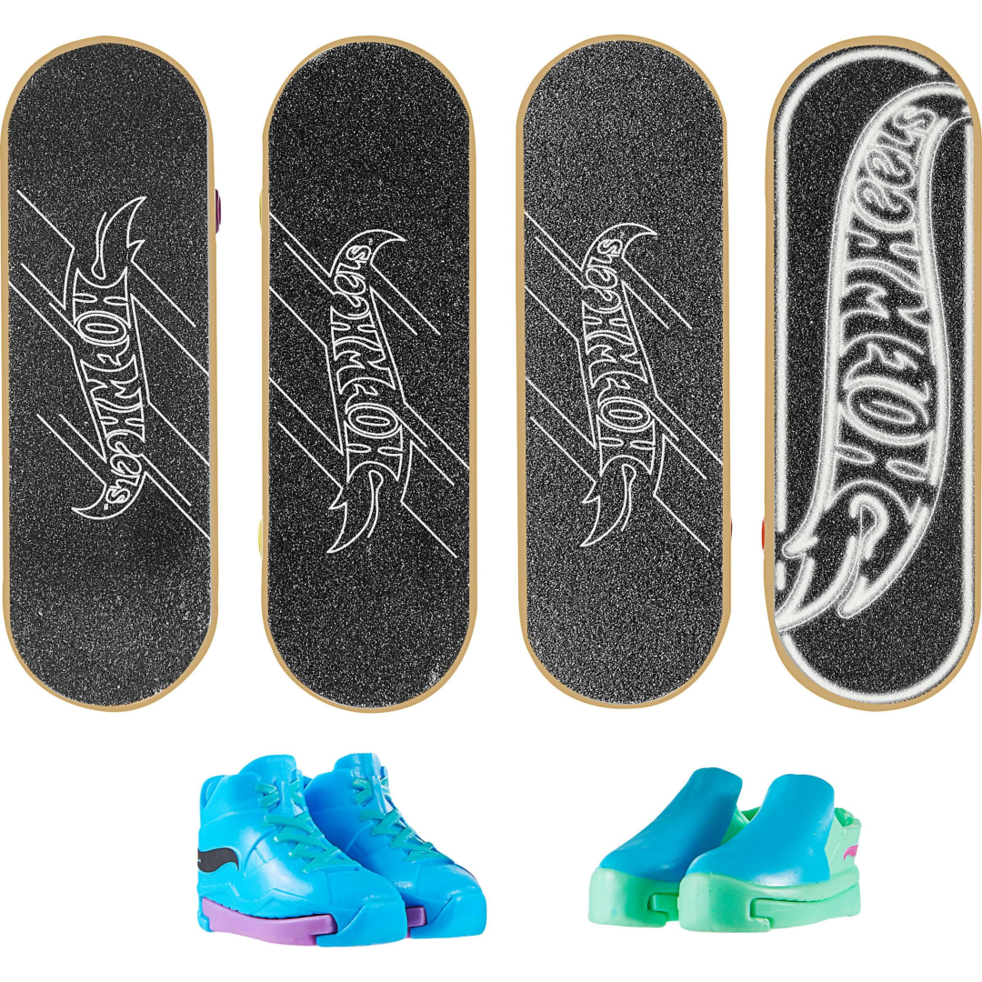 The Hot Wheels Skate Multipack features 4 fully assembled fretboards created in collaboration with iconic skateboarder Tony Hawk, plus 2 pairs of cool skate shoes. The removable set of "sneakers" keeps fingers in place as you master the techniques on the boards, especially helpful for groms who are just learning how to flip and stunt with their tiny fingers. The complete collection of decks features great graphics and decorative finish that combine the creative brilliance of Hot Wheels and Tony Hawk. Each multipack contains 1 exclusive board that cannot be purchased elsewhere. Each board comes fully assembled and features fast axle wheels for superior performance and mobility. The Hot Wheels skate fretboards multipack is a great gift for children aged 5 and up. With these cute designs and eye-catching colours, they will all want to collect. Each sold separately.