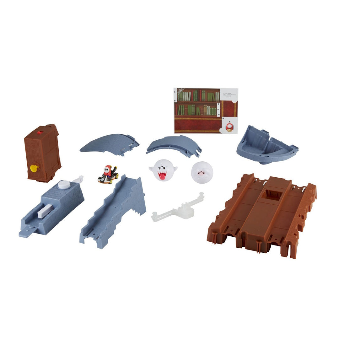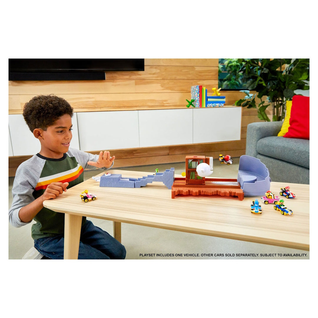 Get ready for a spine-tingling racing adventure with this Hot Wheels Mario Kart Boo's Spooky Sprint Race Track! Perfect for busy parents looking to bring the Mario Kart experience home without breaking the bank. Your little racers will love sending the included die-cast vehicle zooming past ghostly Boo and navigating spooky obstacles on this haunted-themed track. Built with the trusted Hot Wheels quality you know and love, this set brings the thrilling twists of Mario Kart's haunted levels to life.
