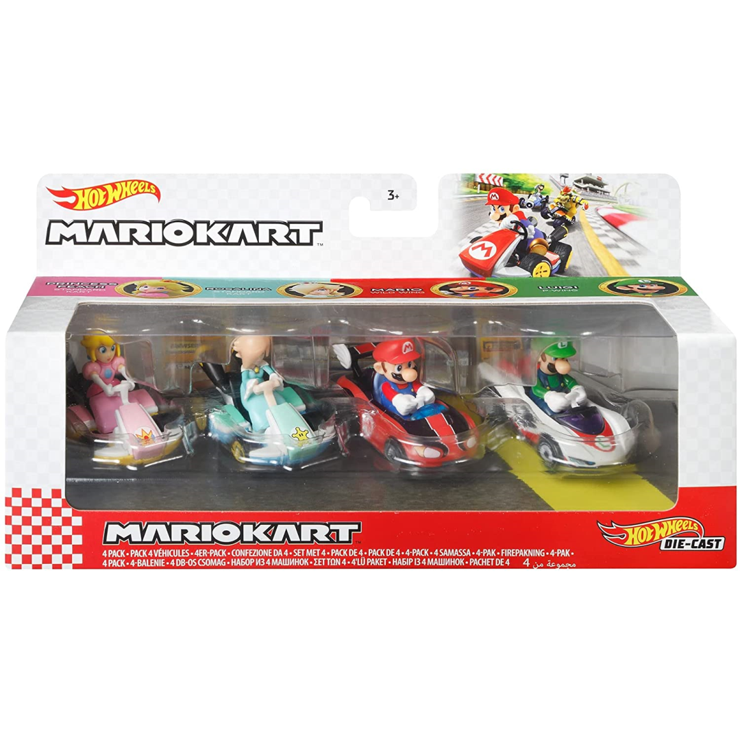 With Hot Wheels Mario Kart 4-packs, kids can mix and match their favourite Mario Kart character-inspired karts before racing and stunting their way through the streets of their hometown. Each set contains four die-cast Mario Kart cars in 1:64 size, one of which is a unique to this set. Fan-favorite character karts perform on Hot Wheels tracks, allowing children to use their imaginations to the fullest extent possible by mixing the excitement of a Hot Wheels performance with the racing and thrills of Mario Kart! These Mario Kart Hot Wheels cars, which provide an immediate collection, offer a wonderful present for collectors and enthusiasts of all ages, especially those aged three and above. Each item is offered individually and is subject to availability. Colours and decorations are subject to change.
