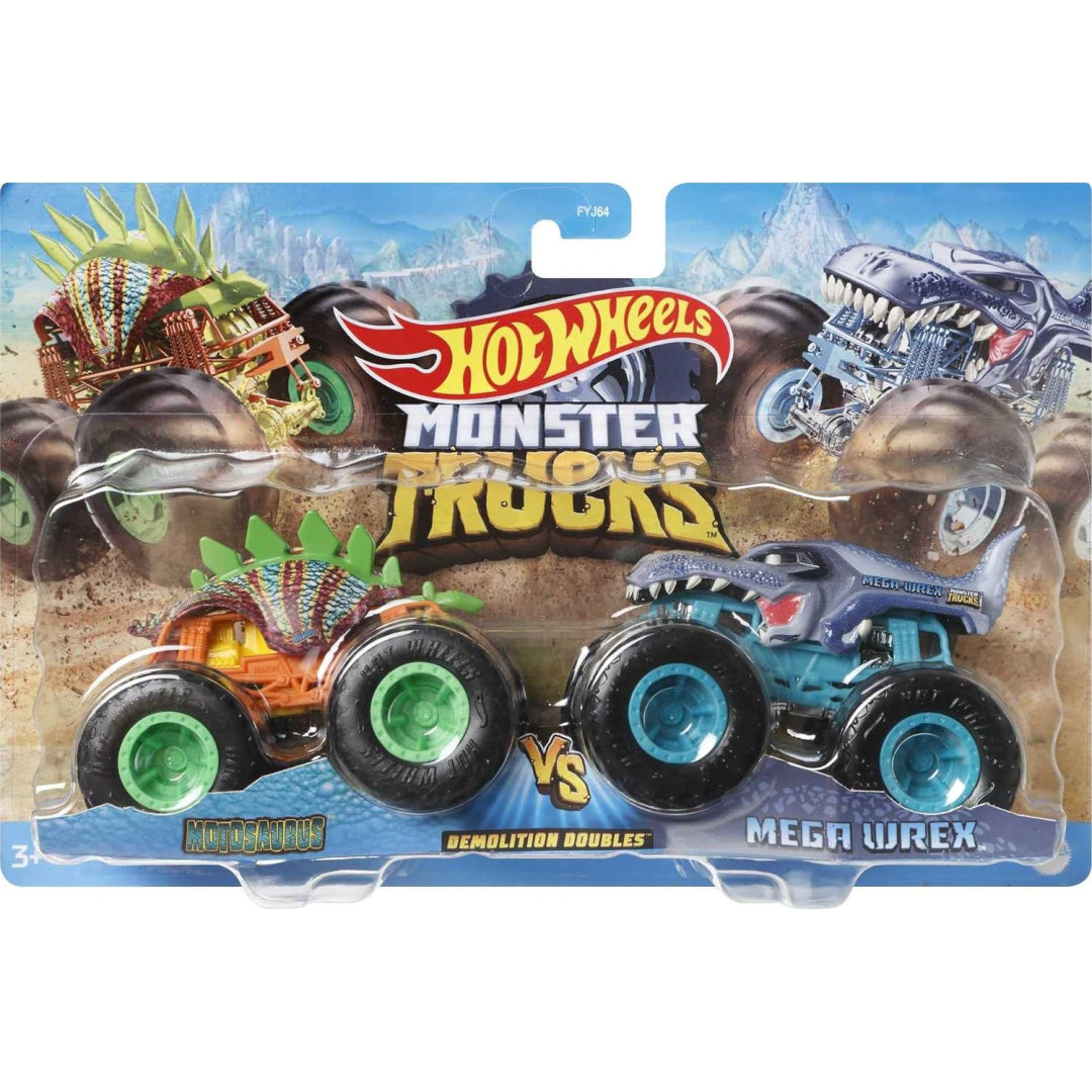 Hot Wheels Monster Trucks Demolition Doubles will amp up the thrill! Epic monster truck fights are brought to life with the Motoaurus vs. Mega Wrex set. It's a titanic battle waiting to happen between these two strong competitors, each with their own distinctive designs and enormous wheels. Crush vehicles, overcome barriers, and let loose with the ferocious joy of monster truck mayhem. This Demolition Doubles set is great for young collectors and enthusiasts as it brings fast-paced excitement to the Hot Wheels Monster Trucks universe. Now let's start the demolition derby!
