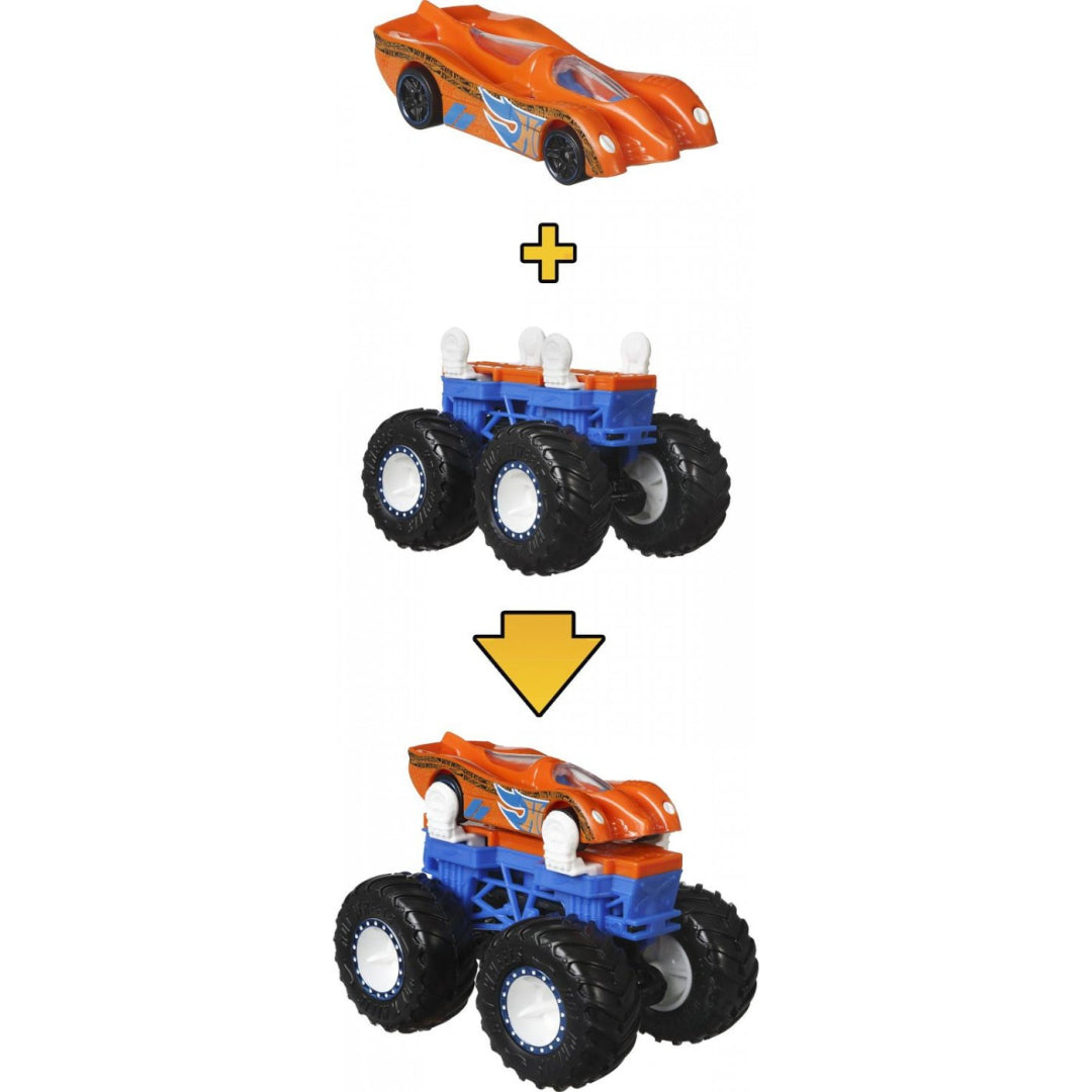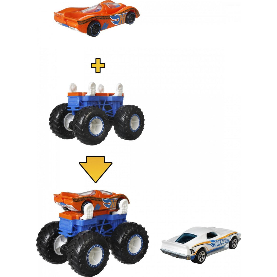 Monster Trucks and Hot Wheels cars have never been compatible with one another before now. Convert your existing Hot Wheels vehicle into a monster truck using the brand-new Hot Wheels Scale Cars 1:64 set. Each set includes five different coloured chassis, and each of those chassis comes with two complementary hot wheels, allowing you to create any configuration you like with the set.