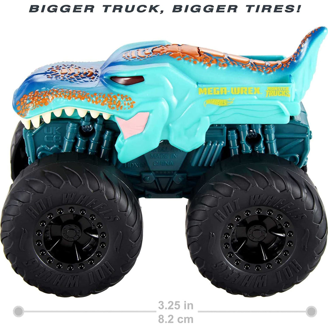 The Hot Wheels Monster Trucks Roarin' Wreckers Mega Wrex truck provides all of the exciting crashing and smashing action that fans have come to expect from the line, and it does so with the addition of lights and sounds to further enhance the overall experience. This vehicle is a favourite among fans because it is a 1:43 scale model and it features the incredible graphics and enormous wheels that are characteristic of the Hot Wheels Monster Trucks brand. If you press a button, you will be able to hear engine and crushing sounds in addition to the theme song for Mega Wrex œ it will feel just like you are at the live show. In addition, there is a light inside the cab that can be seen by the children through the windows! They will want to acquire all of them so that they can hold competitions with sound effects in the comfort of their own homes (each sold separately). There may be some variety in the colour and decorations.