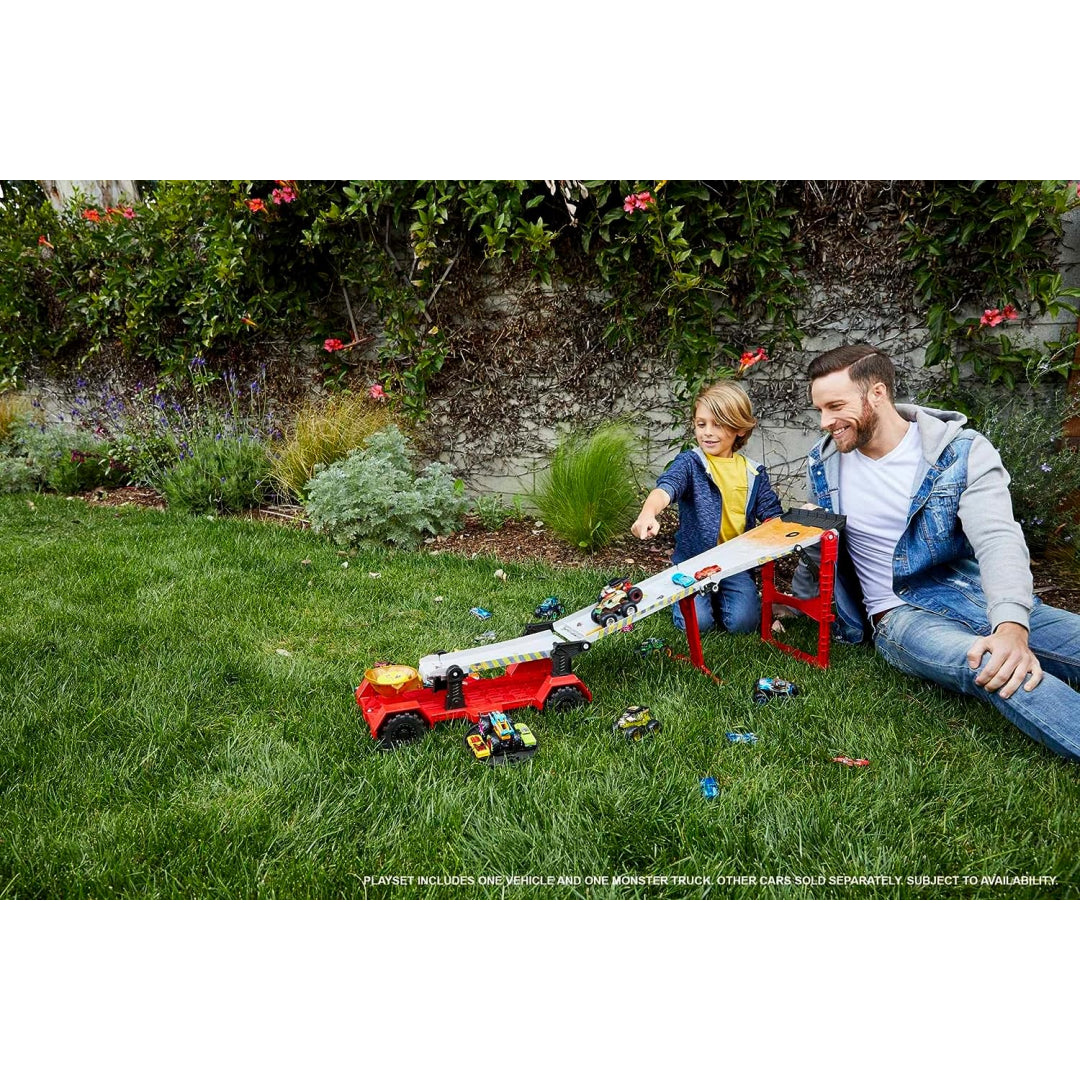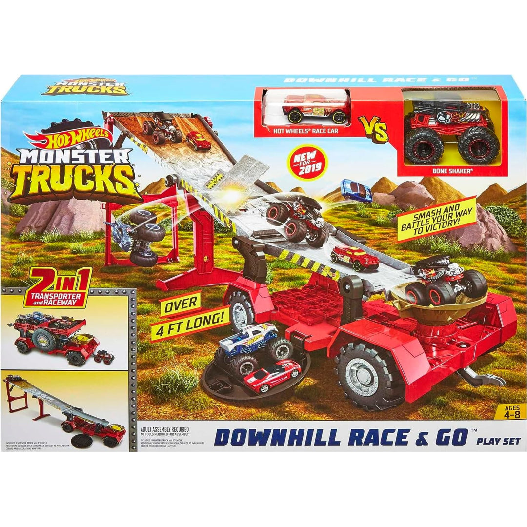 Adds a Hot Wheels monster truck and a Hot Wheels car to the Hot Wheels Monster Trucks Downhill Race and Go Toy Cars Play Set.