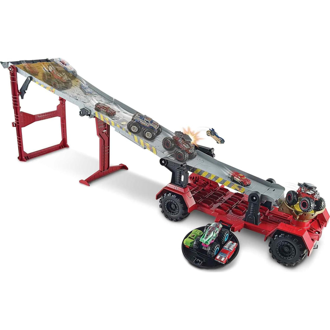 With this entertaining kids toy, you may be the first to fall in the trophy cup, which causes the track to break and send the slower cars flying. Designed to fit both monster trucks and Hot Wheels vehicles