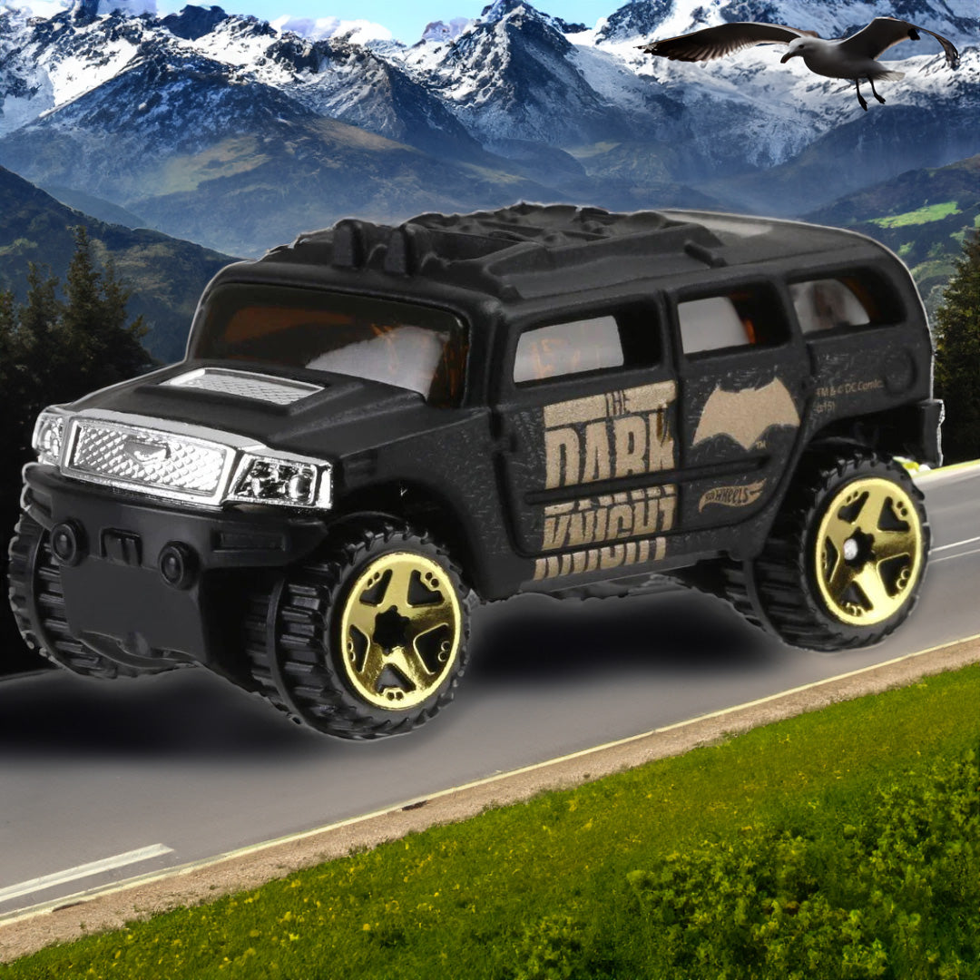 This Hot Wheels Batmobile is an epic SUV from the Batman vs Superman Movie that was released in 2016, featuring a sleek Black design, Gold rimmed wheels, and Gold detailing on the side that says "Dark Knight", so there is no doubt who owns this monster of a truck. This is the perfect addition for any Batman fan or movie buff.