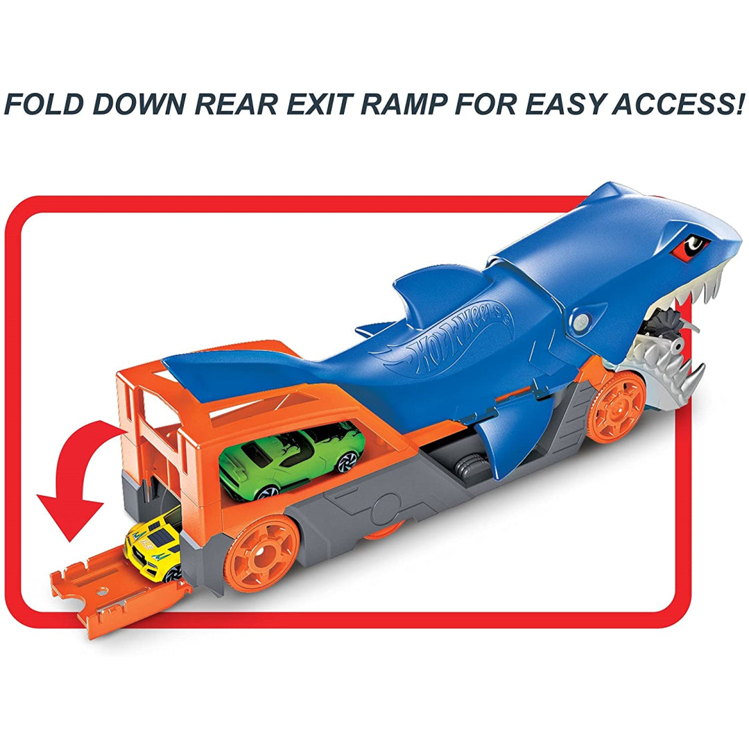 For a novel and entertaining method of moving and storing Hot Wheels vehicles, this awesome transporter with a shark-inspired design eats up cars and stores them in its belly.With an escape ramp out rear that propels vehicles to their next adventure, this bigger version of the beloved Shark Bite Hot Wheels car has all the hallmarks of a kid-favorite adversary. The