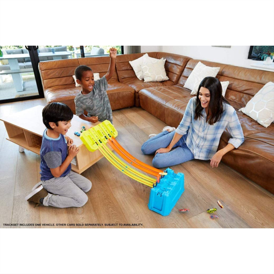 Get ready for epic racing action with this amazing Hot Wheels Track Builder Multi-Lane Speed Box! Perfect for budget-savvy parents who want maximum play value, this versatile set packs tons of racing fun into one convenient storage bin. Your little speedsters can create gravity-defying stunts by connecting tracks to the lid, leading to a spectacular four-lane jump finale that'll have them cheering for more!