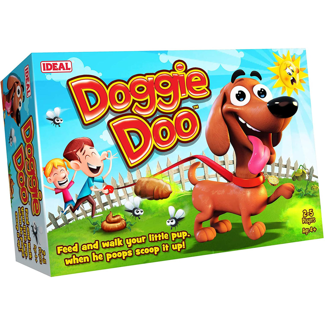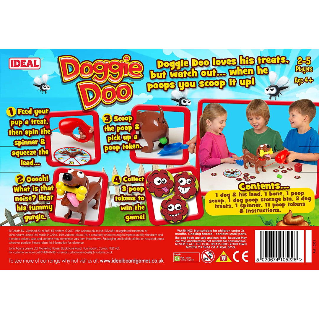 Feed your puppy and take him for a stroll. Pick it up when he poos! Meet Doggie Doo, a joyful, beautiful dog that enjoys nothing more than his favourite snacks. Feed Doggie Doo his food and pump his lead while you play the game, but when he poops, oh no...scoop the poop to get a token! When a player collects three poo tokens, the game is over.
