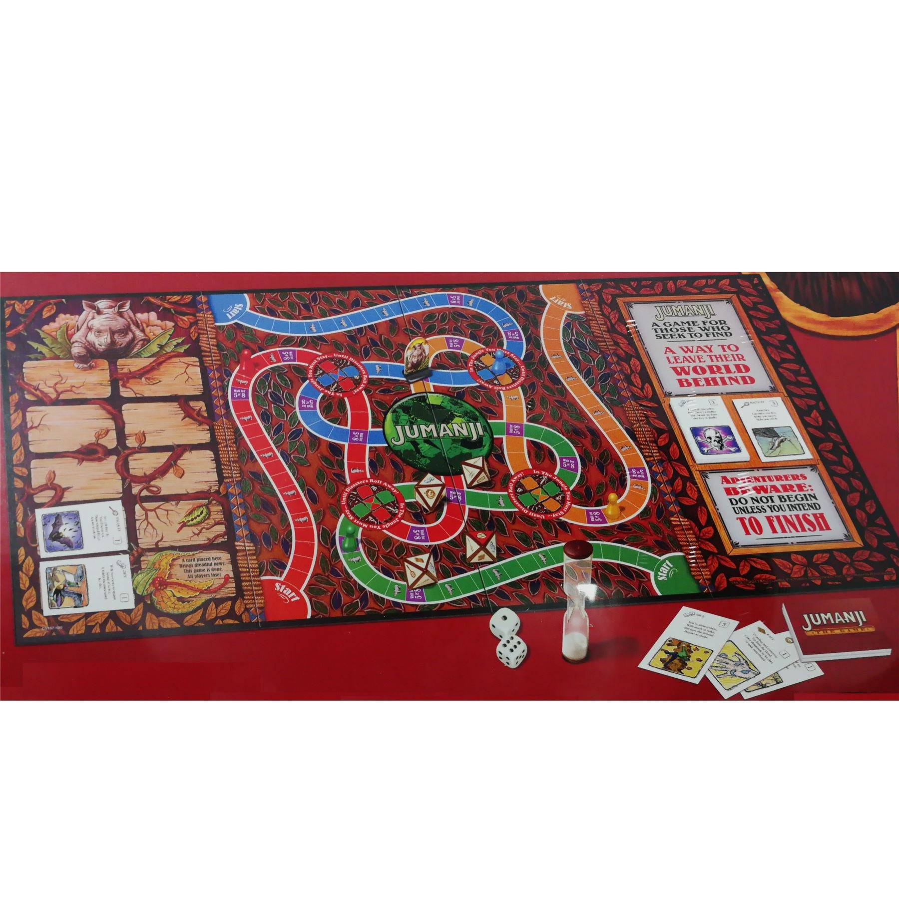 In the untamed land of Jumanji, chasing lions, charging rhinoceros, snapping crocodiles, and other frightening animals are just a dice roll away! Take your pawn and navigate through the jungle by rolling an eight-sided number dice. Draw a hazard card, then decode the hidden message with your decoder to see whether calamity hits. Your teammates must rush against the clock to save you. The rainforest threatens the Doomsday Grid and starts to fill it up.