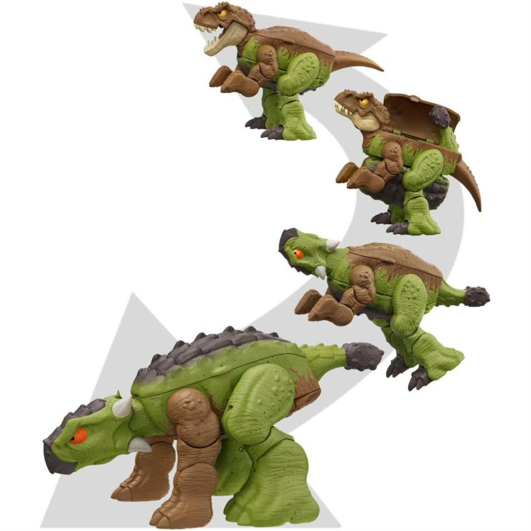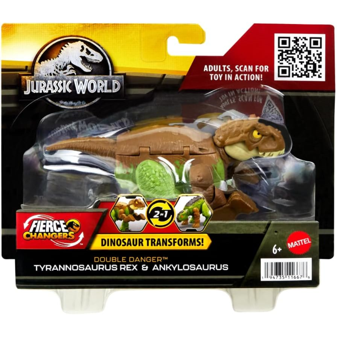 The Double Danger T from Jurassic World. For children aged 6 and older, the Rex to Ankylosaurus figurine provides an amazing transition experience. The T-Rex is made possible by this Fierce Changers toy. In ten simple manual steps, T-Rex and Ankylosaurus may go from herbivores to carnivores and back again. This figure brings the dinosaurs to life with fully articulated features and boasts two distinct decos that highlight the strength and details of each species. Kids may engage in exciting prehistoric conflicts and creative adventures with this amazing morphing play toy.