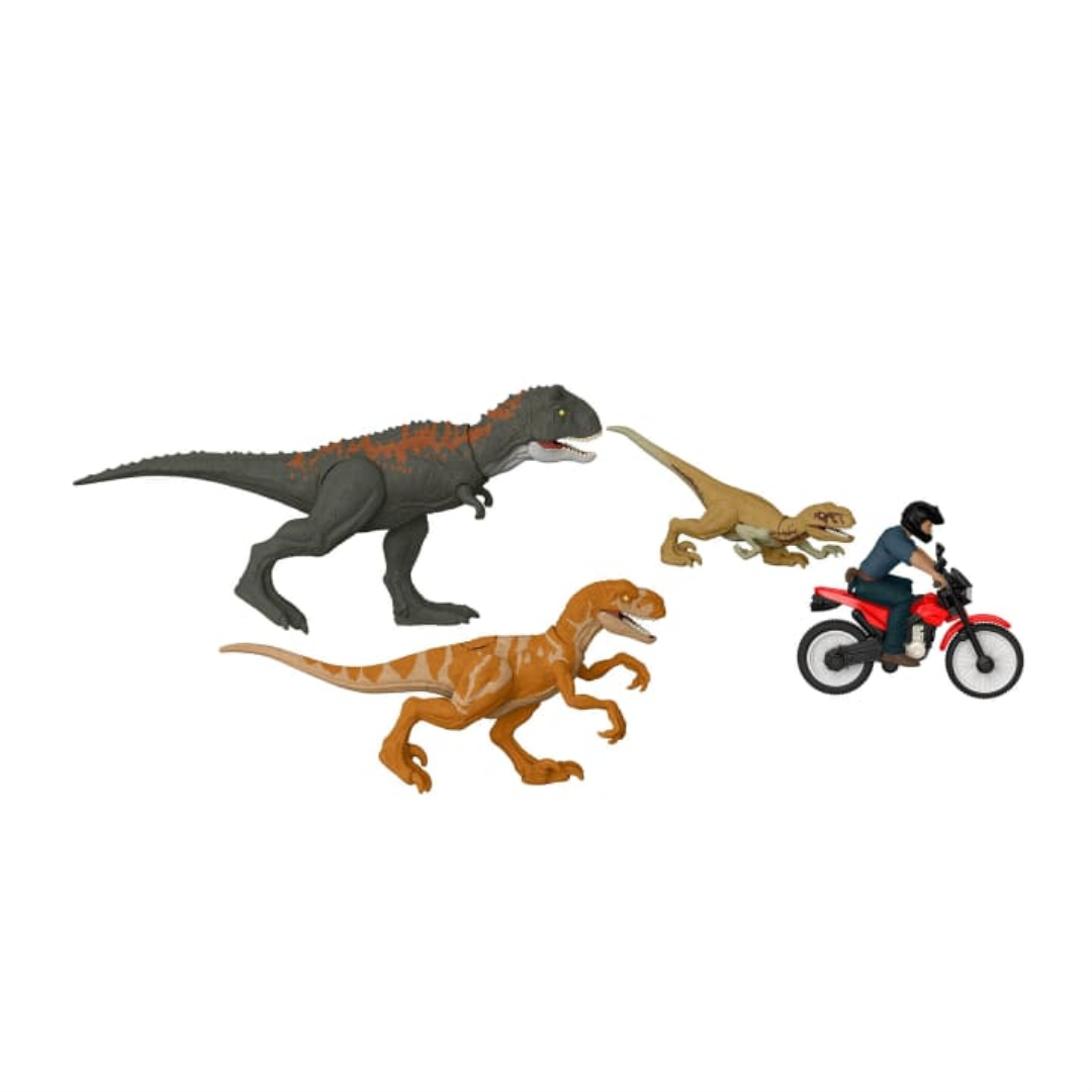 Get ready for thrilling action and adventure with Jurassic World Dominion! This pack, inspired by the movie, includes Owen Grady and 3 dinosaur action figures, plus a detailed motorcycle. This multi-item storytelling pack is inspired by an exciting scene from Jurassic World Dominion but provides the pieces to fuel multiple storylines. The Owen Grady figure, with helmet, fits on the motorcycle to make the action come to life! The dinosaur figures include two Atrociraptors, introduced in Jurassic World Dominion, as well as a juvenile Carnotaurus. All the figures feature articulated joints for reliving all the classic movie moves or posing in an adventurous display. Motorcycle has rolling wheels for push-along play. Bring all the dinosaurs TO LIFE with extended digital play using Augmented Reality! Dare to see how REAL dinosaur play can get! Just scan the hidden DNA code with any smart device to unlock the AR experiences in the free Jurassic World Facts app. Smart device not included. Makes a great gift for Jurassic World fans ages 4 years and older. Colors and decorations may vary.
