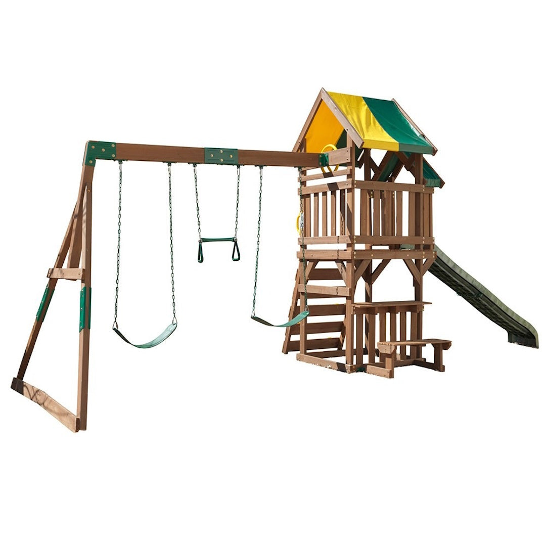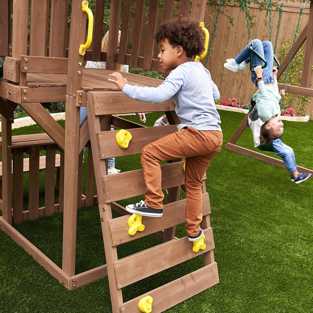 Your little adventurers can conquer the rock wall, zoom down the slide, or challenge each other to swinging competitions. When it's time for a breather, the built-in bench is perfect for snack breaks or storytelling sessions. Those clever people at KidKraft have even included shaded areas both up top and below, creating cool hideaway spots for hot summer days - brilliant for setting up a sandpit or quiet reading nook.