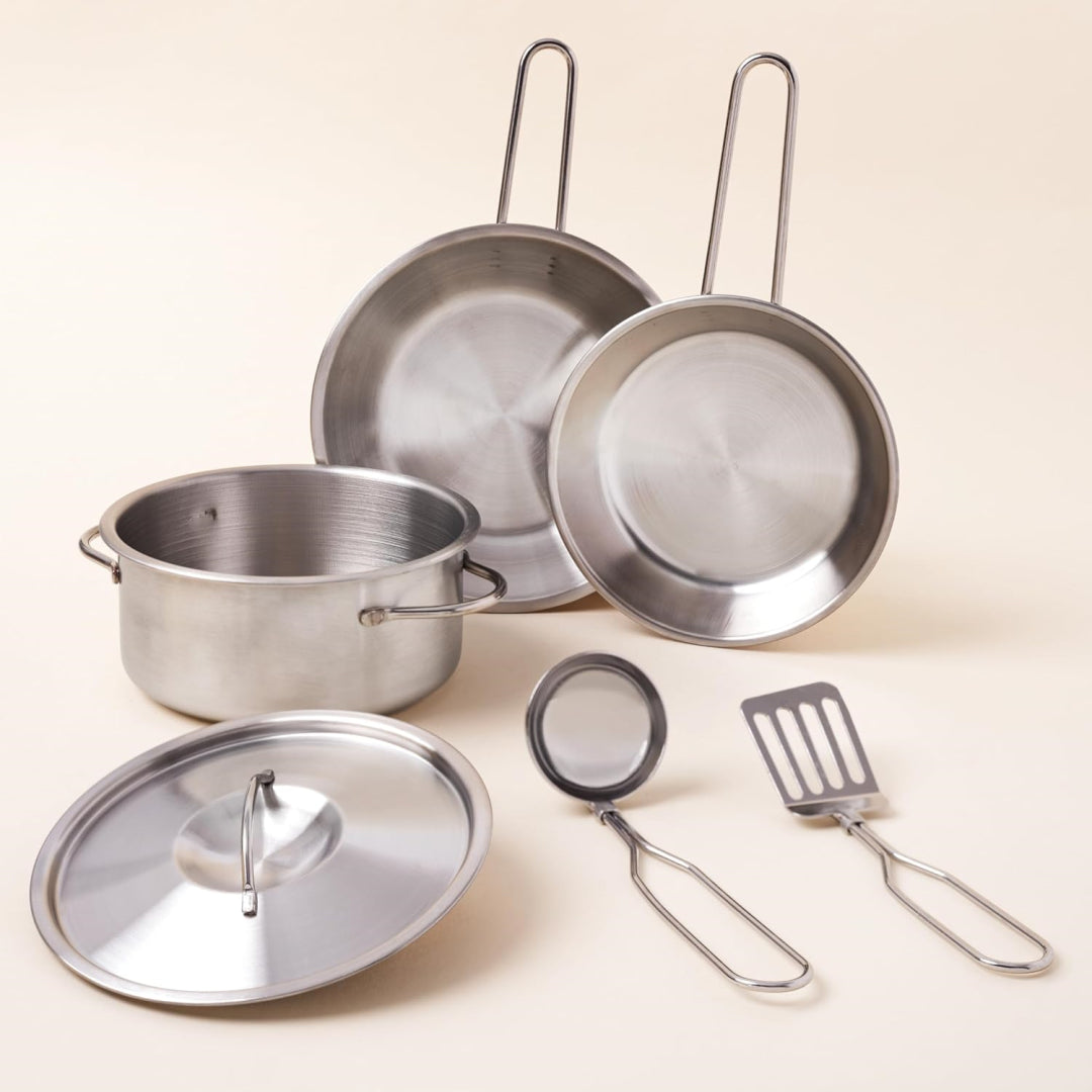Let the culinary adventures begin! This incredible KidKraft metal cookware set brings real kitchen excitement to playtime without breaking the bank. Perfect for your little chef, this 11-piece collection includes proper metal pans, a lidded pot, and essential cooking utensils that look just like mum and dad's! Plus, the included play food - from fresh broccoli to tasty chicken legs - means dinner is ready to be served straight away.