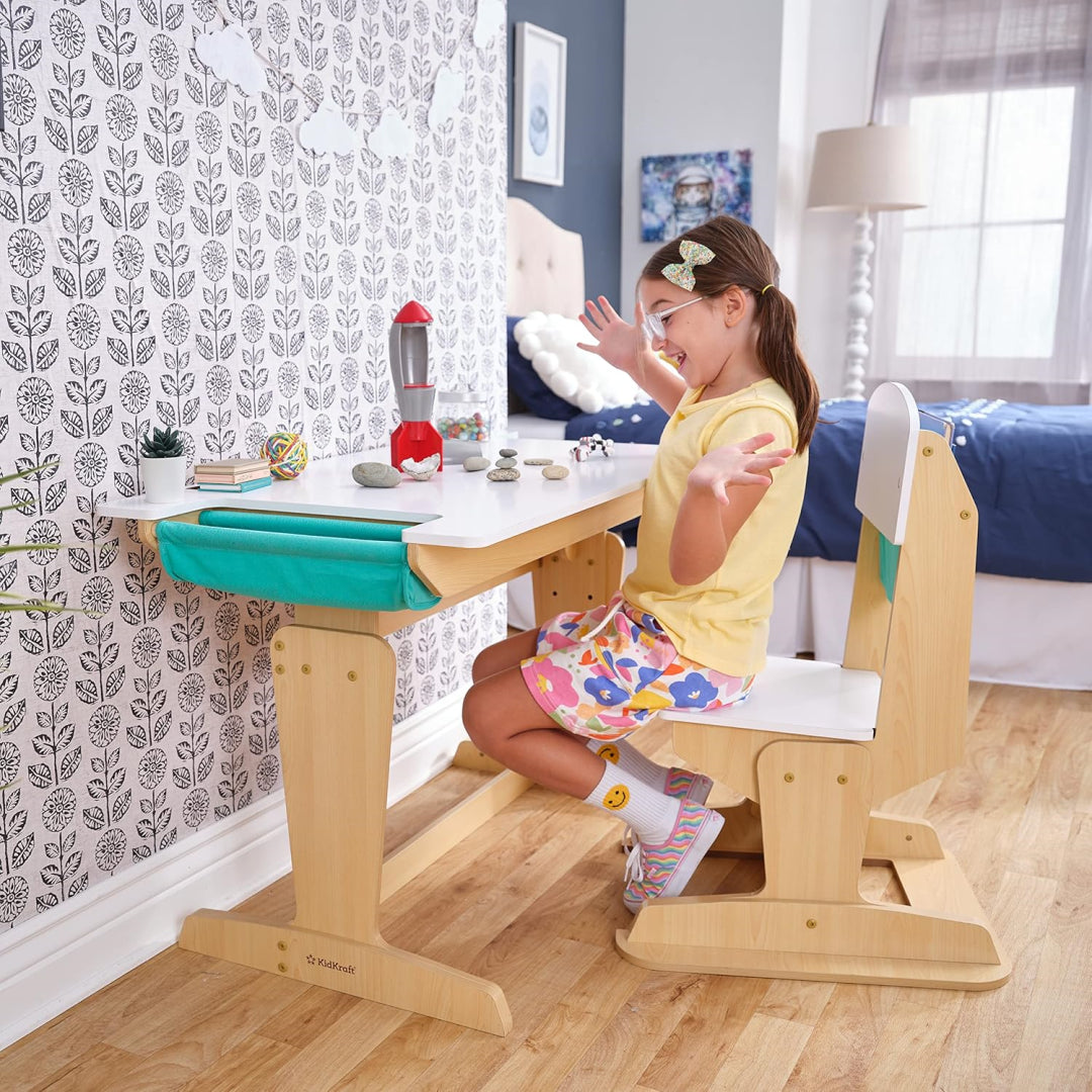 Designed for children aged 4 and up, this sturdy set supports up to 120 lbs and features safe, rounded corners. The natural and white colour scheme fits beautifully in any room, while the quick EZ Kraft Assembly means less time building and more time creating. The desk adjusts from 21.65" to 25.59" in height, and the chair from 14.17" to 18.11" - perfect for those growth spurts!