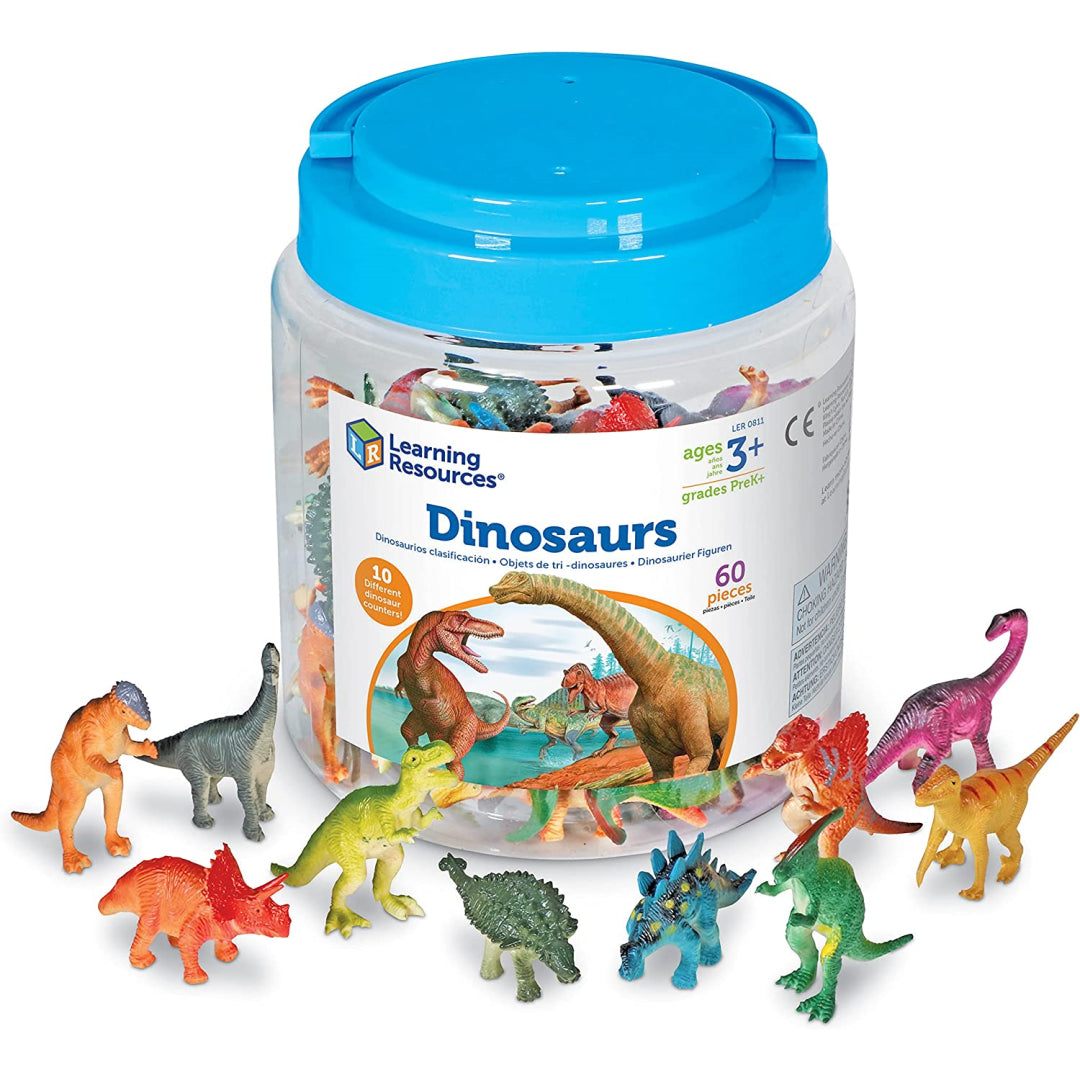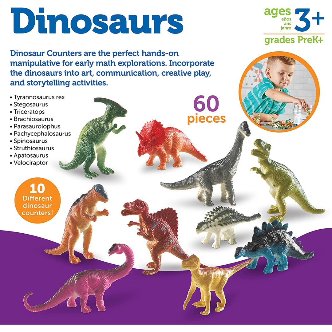 Learning Materials Counters for dinosaurs. Tyrannosaurus Rex, Stegosaurus, Triceratops, Brachiosaurus, Pachycephalosaurus, Spinosaurus, Stuthiosaurus, Apatosaurus, and Velociraptor are among the ten popular dinosaur species shown in these colourful dyno counters, each with realistic detail. Soft rubber animal counters with exquisite detail are perfect for developing early numeracy skills and storytelling. In a handy plastic storage box, the set comes with 60 plastic counters. The T-Rex counter is the largest and has a 5 centimetre height. For student prizes, counters are perfect as well. For people three years of age and older.