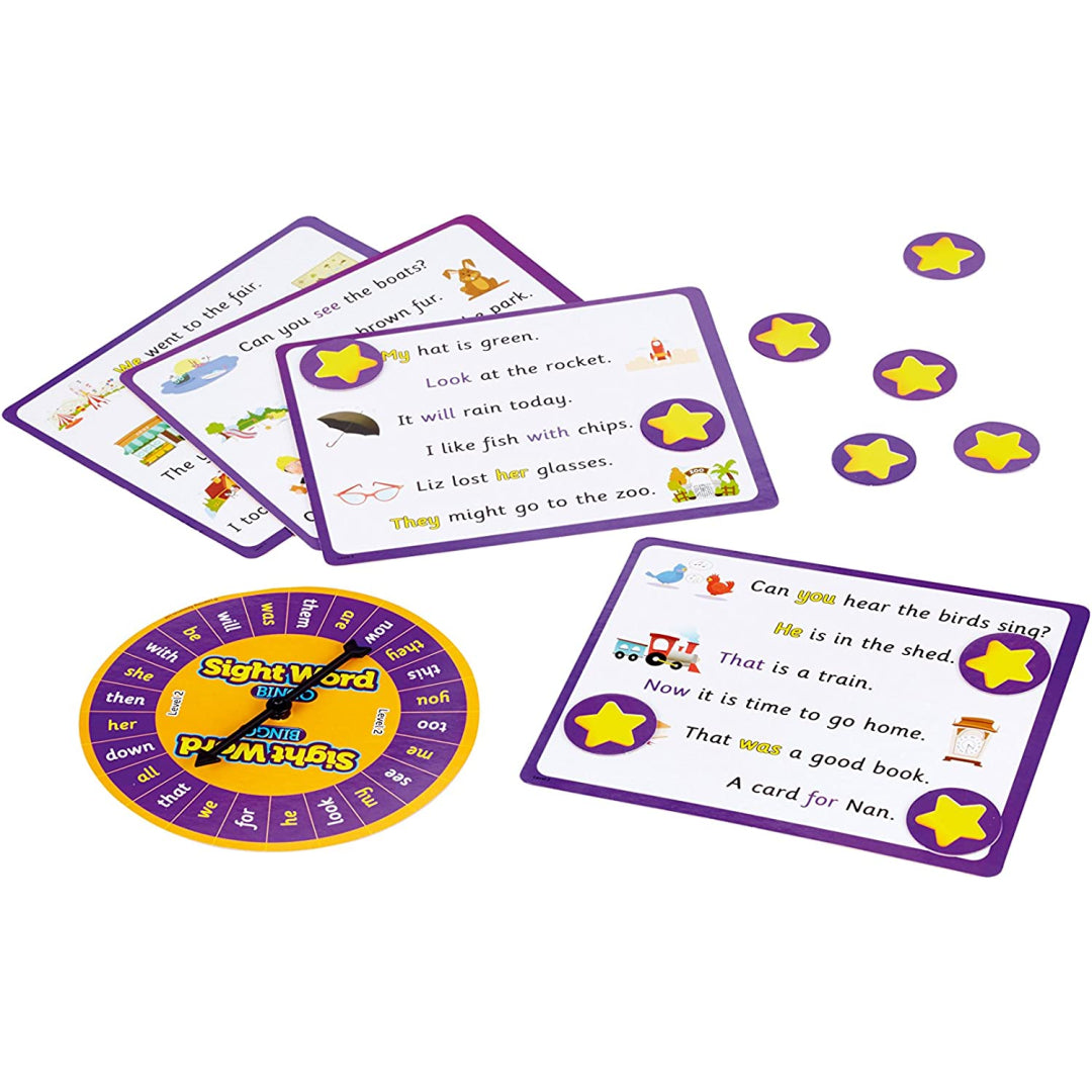 Through the use of words from Phase Three of the Letters and Sounds Phonics Framework, Level 2 assists students in identifying sight words within a caption. When they locate the word on the spinner, players yell "bingo" and check their caption cards for it. Then, to indicate that the word has been discovered, players cover the illustration at the end of that line. Whoever covers three photographs first wins.