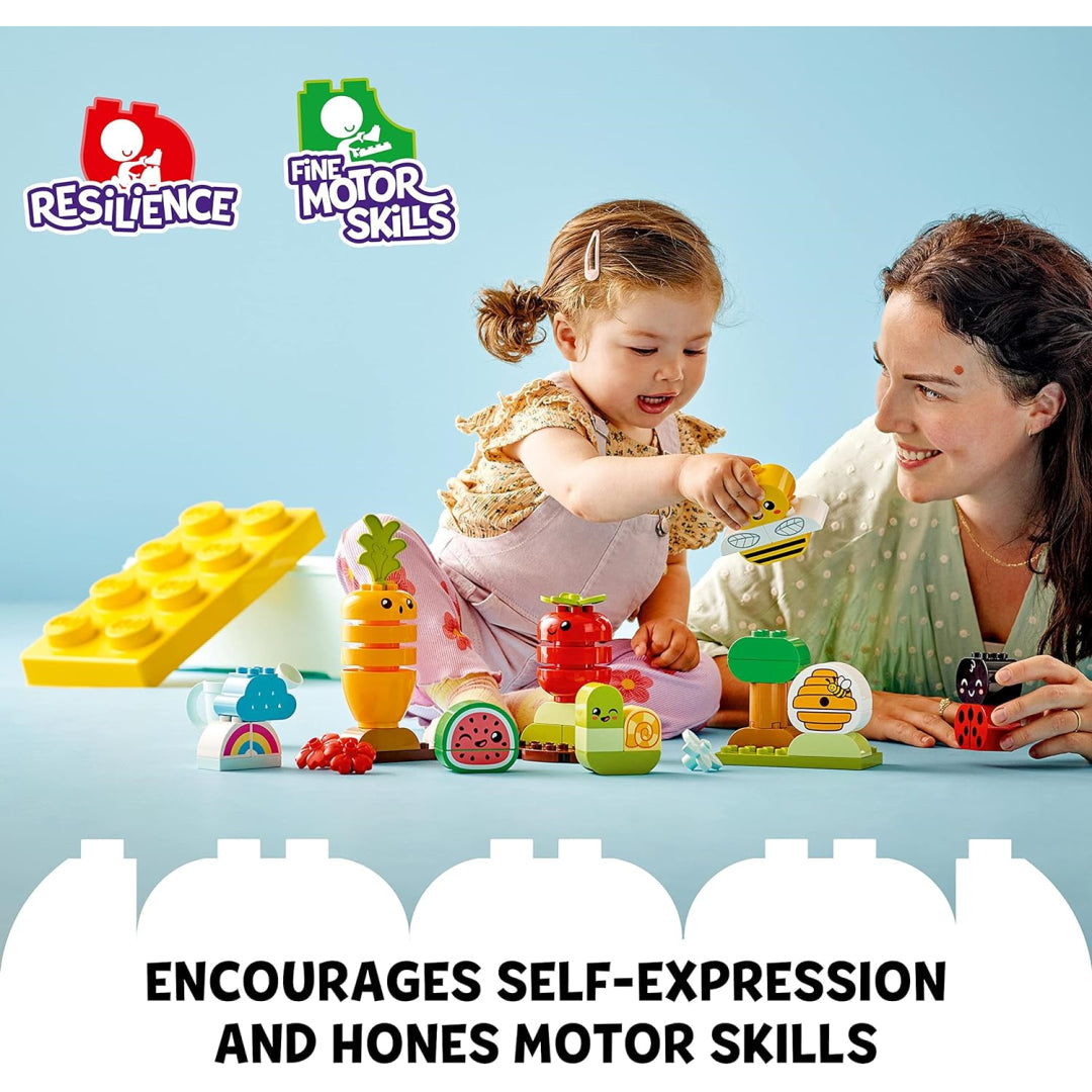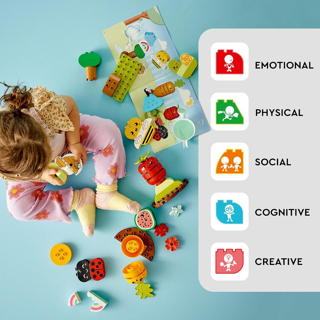Teach toddlers about nature with the Lego Duplo Organic Garden learning toy set for children aged 1.5+. Includes stacking toys of tomatoes, carrots, and watermelons, ladybird, bee, caterpillar toys, beehive, trees, flowers, rain-cloud, rainbow bricks, and a watering can. This versatile Lego Duplo set develops self-expression and fine motor skills. Comes with a handy Lego Duplo brick box for easy storage.