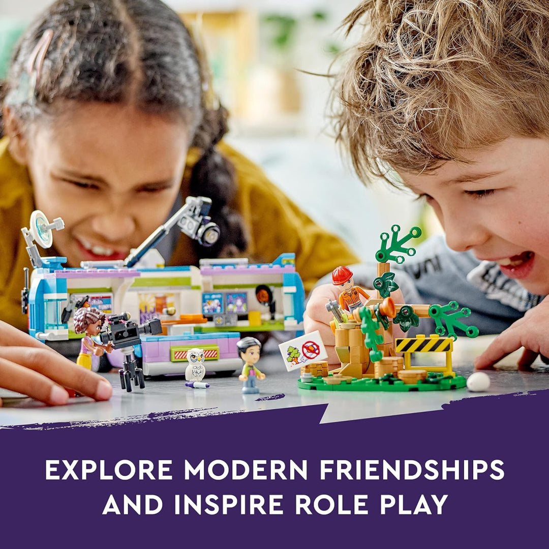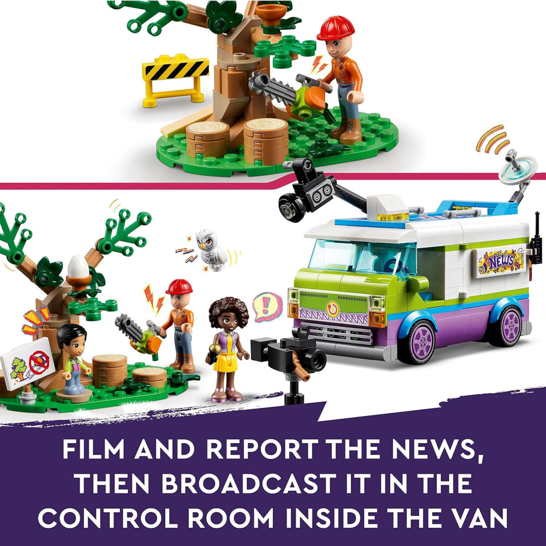 The setup for the LEGO Friends toy van includes an owl toy for rescue, an opening toy truck with a news control centre, and several news reporting accessories.