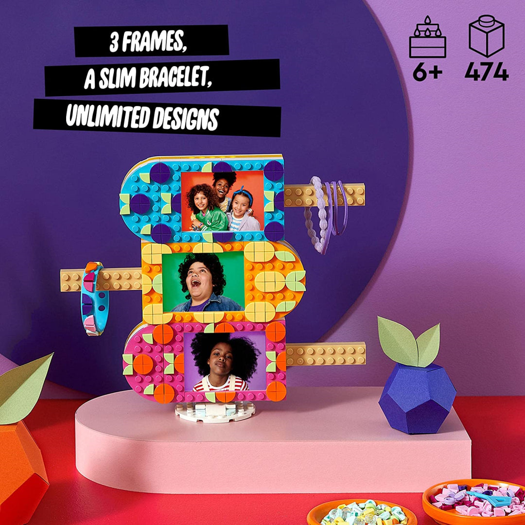 This arts and crafts set enables children to construct and personalise three photo frames with an ice cream motif, as well as a pastel-colored LEGO DOTS bracelet that matches the frames.