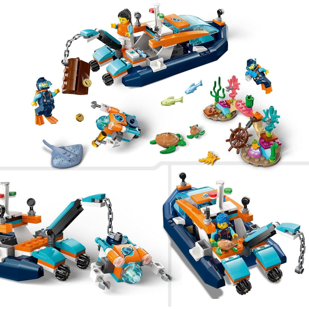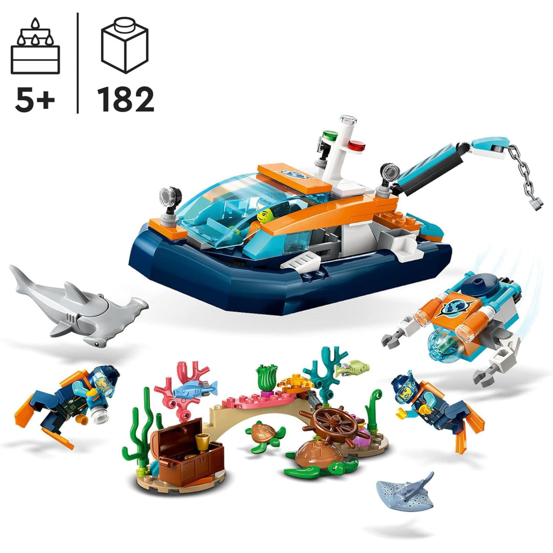 Embark on aquatic adventures with this Lego City Explorer Diving Boat set featuring a toy inflatable boat, mini submarine toy, and sea animal figures. Young explorers can build a modern toy boat, mini submarine, and coral reef setting. Utilize the boat's crane to deploy the 'autonomous' mini submarine and explore the ocean floor. Includes 3 minifigures, manta ray, hammerhead shark, crab, fish, and turtle sea animal figures. Children aged 5+ can create imaginative stories with this fun Lego underwater set, exploring the coral reef and a sunken treasure chest.