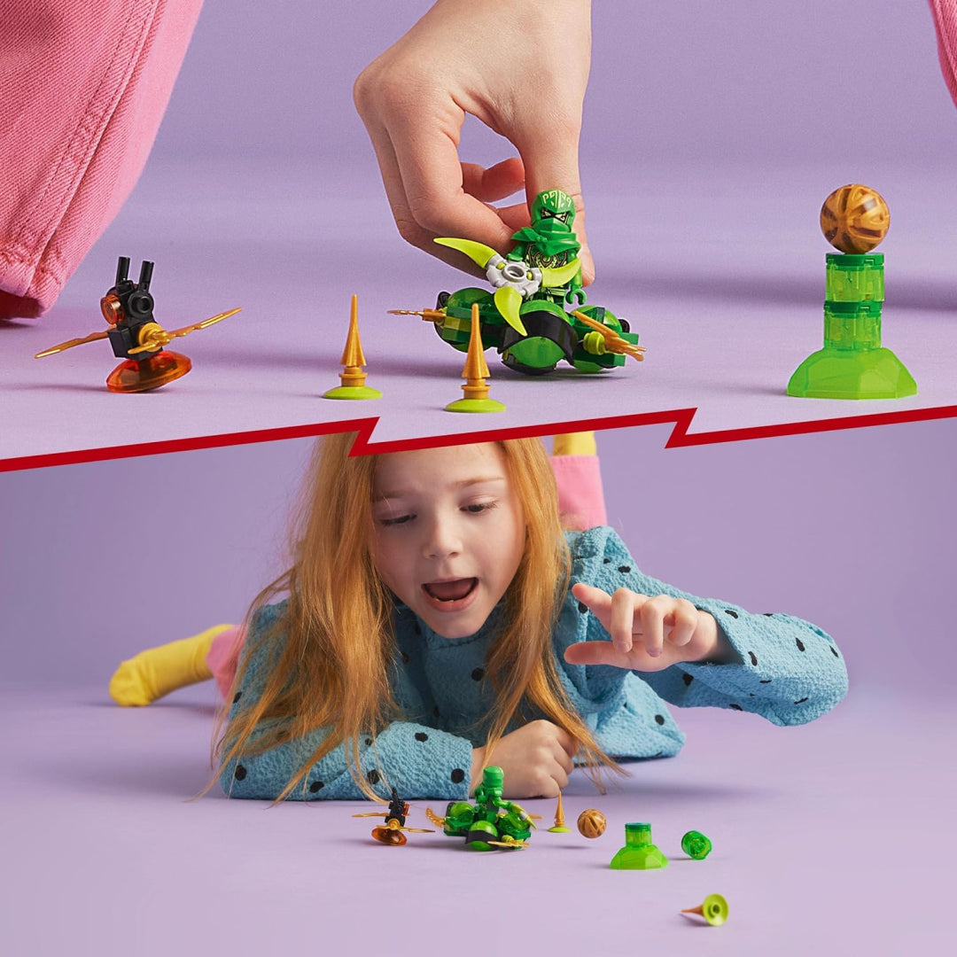Fans can help train Ninjago Lloyd to complete an obstacle course with this Lego Ninjago Lloyd’s Dragon Power Spinjitzu Spin ninja toy for kids aged 6+. The playset comes with a Dragon Power Lloyd Ninjago minifigure, plus an Imperium Droid figure that can tumble around and flip over when hit. The collectible spinning toy playset also comes with a collectible golden dragon energy core element in a bowl and 2 spike obstacle elements. Kids place the Ninjago Lloyd minifigure inside the spinner adorned with 3 exclusive green dragon power elements, spin it, and watch him rotate. Lloyd needs to move with speed and agility to avoid the spikes, take down the Imperium Droid, and grasp the prized golden dragon energy core element.