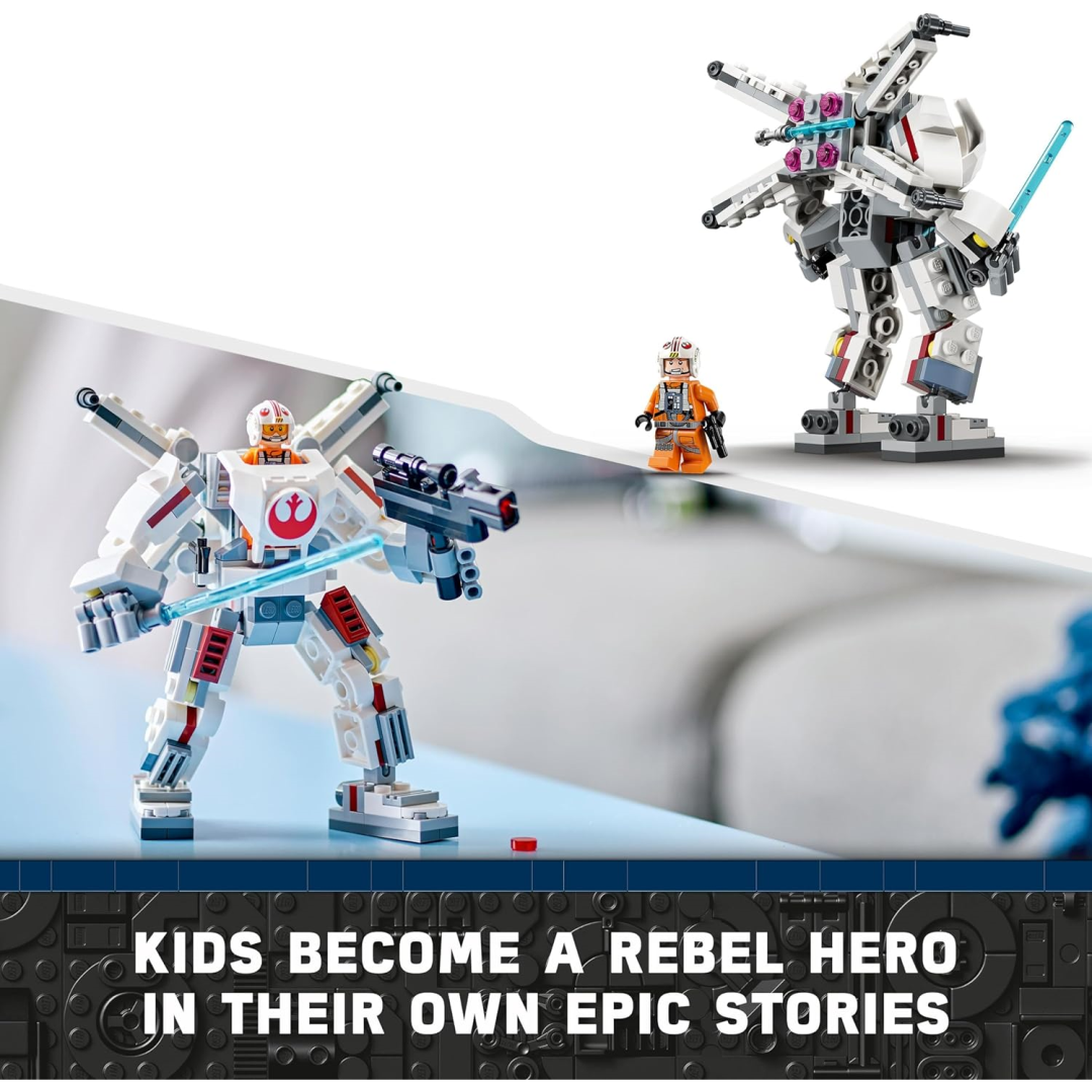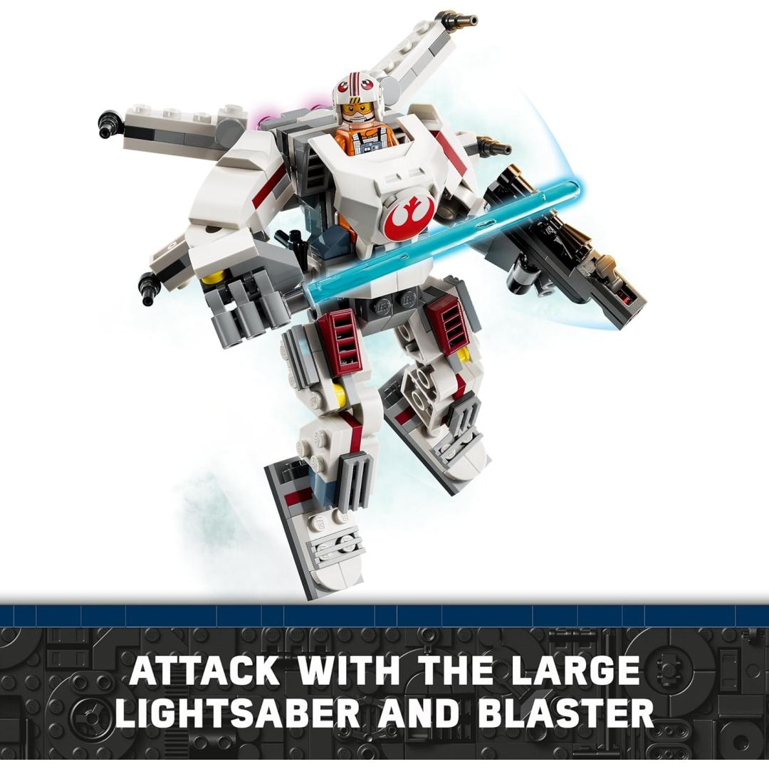 This simple-to-assemble Luke Skywalker X-Wing Mech is a great way to introduce children to the Lego Star Wars world via play and exhibition. This well-known Star Wars minifigure is packaged with a blaster gun and lightsabre. Posable hands, feet, and limbs, an opening cockpit, an adjustable jetpack, a sizable lightsabre, and a blaster that shoots studs are all included. This assembleable mech toy is a part of a line of separately available Lego Star Wars mech kits. Boys and girls six years old and above will enjoy this Lego brick-built mech toy, which is perfect for any child Star Wars enthusiast. Kids can rotate, zoom in, and see a digital representation of this model while they construct by using the Lego Builder app.