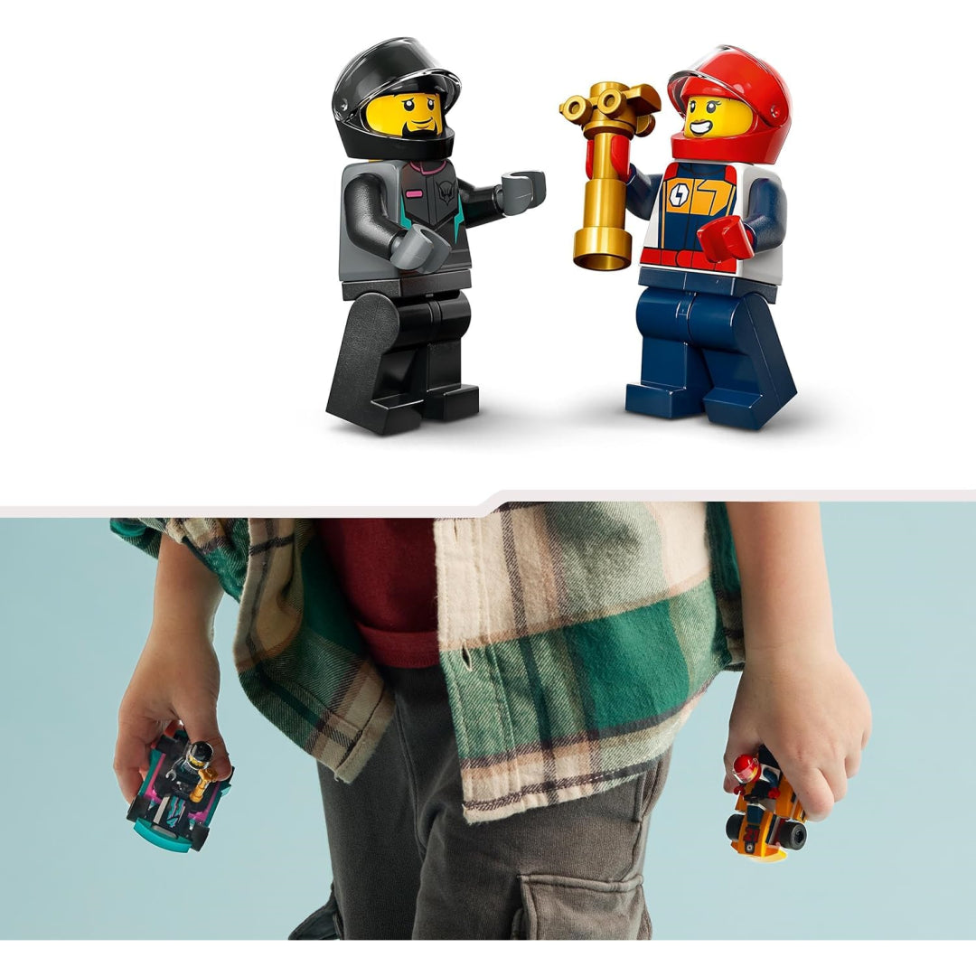 For boys and girls aged five and above, the Lego City Go-Karts and Race Drivers vehicle construction toy promises thrilling racing fun. Includes two driver minifigures, a winner's trophy element, and all the parts youngsters need to assemble an orange and turquoise go-kart toy. Children may unleash a world of imaginative play by inserting the minifigures of go-kart drivers into the cockpits of the Lego cars. Kids can monitor their progress, store virtual sets, and zoom in and rotate their Lego go-kart toys in three dimensions with the Lego Builder app. When you combine this little go-kart racing kit with other Lego City pieces (separately available), you may unleash even more fun and adventures.