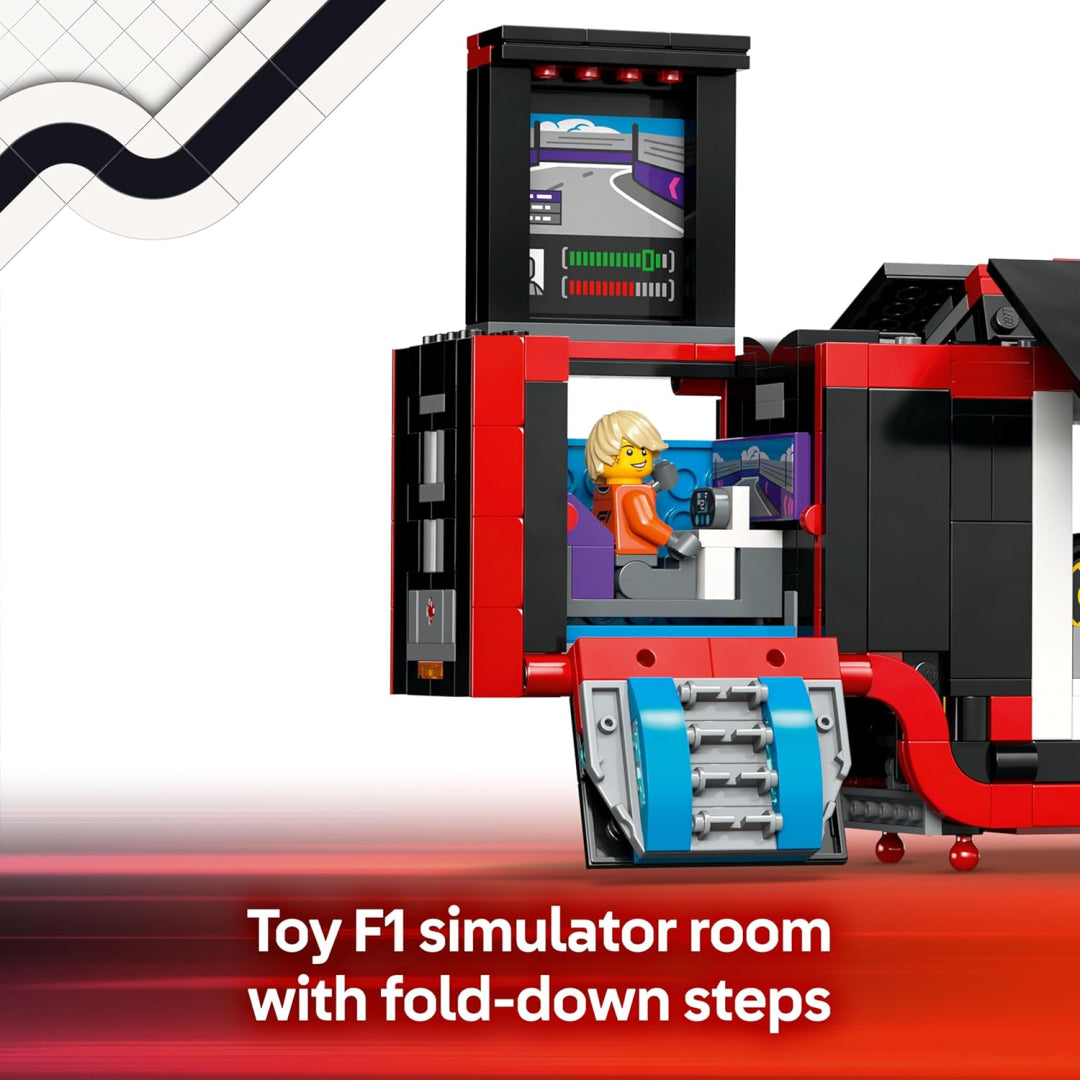 This brilliant set includes a low-loader trailer complete with an F1 simulator room where drivers can practice before the big race, a double vehicle bay to house both racing machines, opening panels for easy access, a rear hatch, and ramps for smooth loading. Two sleek F1 cars sit ready to speed off, whilst two driver minifigures and three race crew members keep everything running like a professional team. There's even a winner's trophy to celebrate victory after an exciting race.