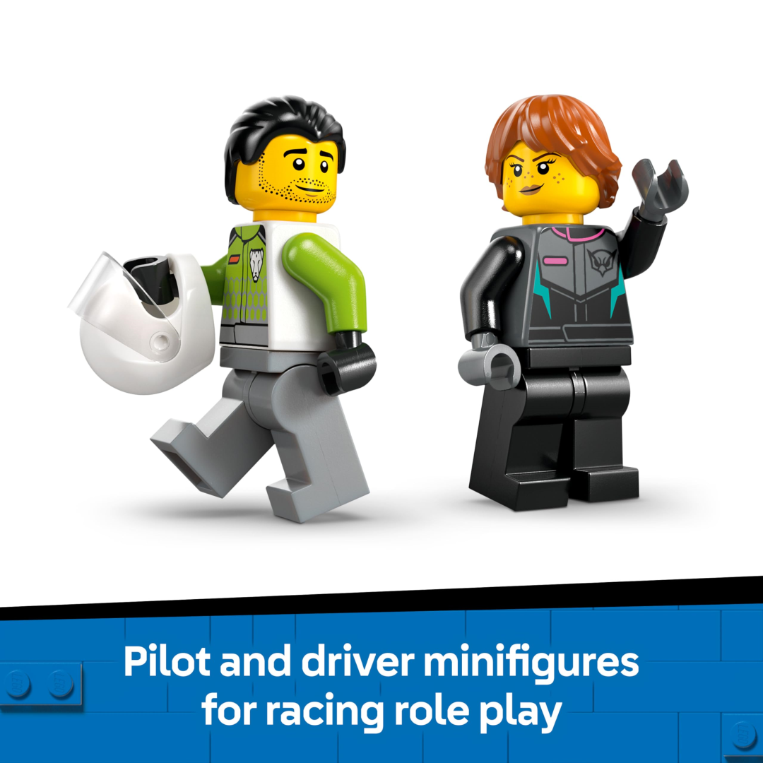 Two LEGO City minifigures join the fun – a pilot and racing driver, each with swappable hair and helmets so the racing storylines never get stale. Whether it's an aerial chase or a drag race showdown, your little ones control the action.