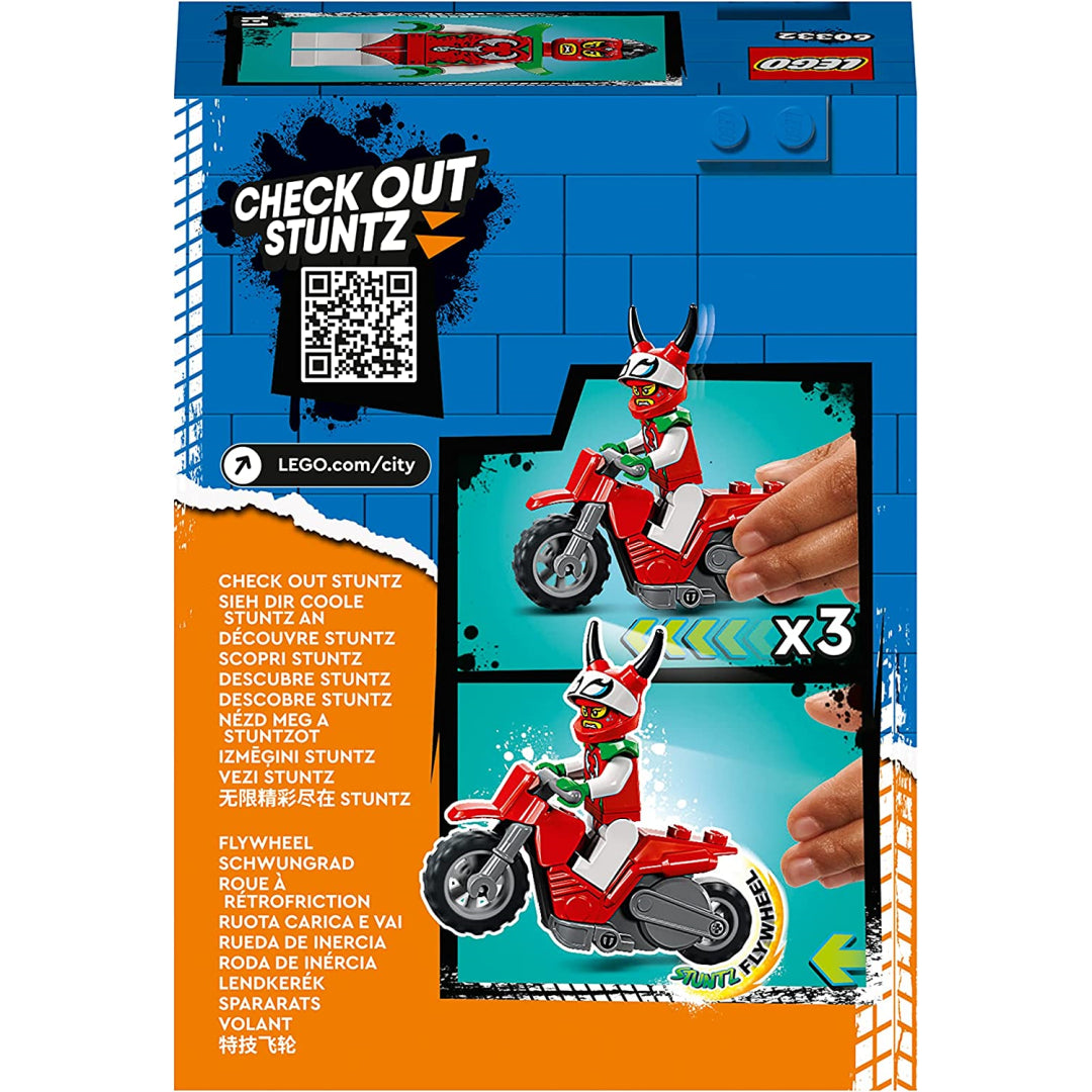 The LEGO City Stuntz toy is intended for children over the age of five, and it comes with a toy motorcycle that is propelled by a flywheel as well as a LEGO racing minifigure.
