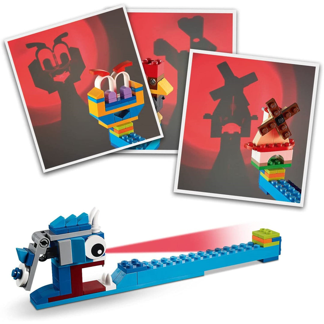 Kids choose a model, construct it, press a button on a Light Brick to cast its shadow, and then add another picture with the second Shadow Caster. A castle, a funny face, a princess, a bat, a rooster, a crook, a pirate ship, an owl, a ghost, a windmill, a shark, and a dinosaur are among the 12 easy-to-build toys.