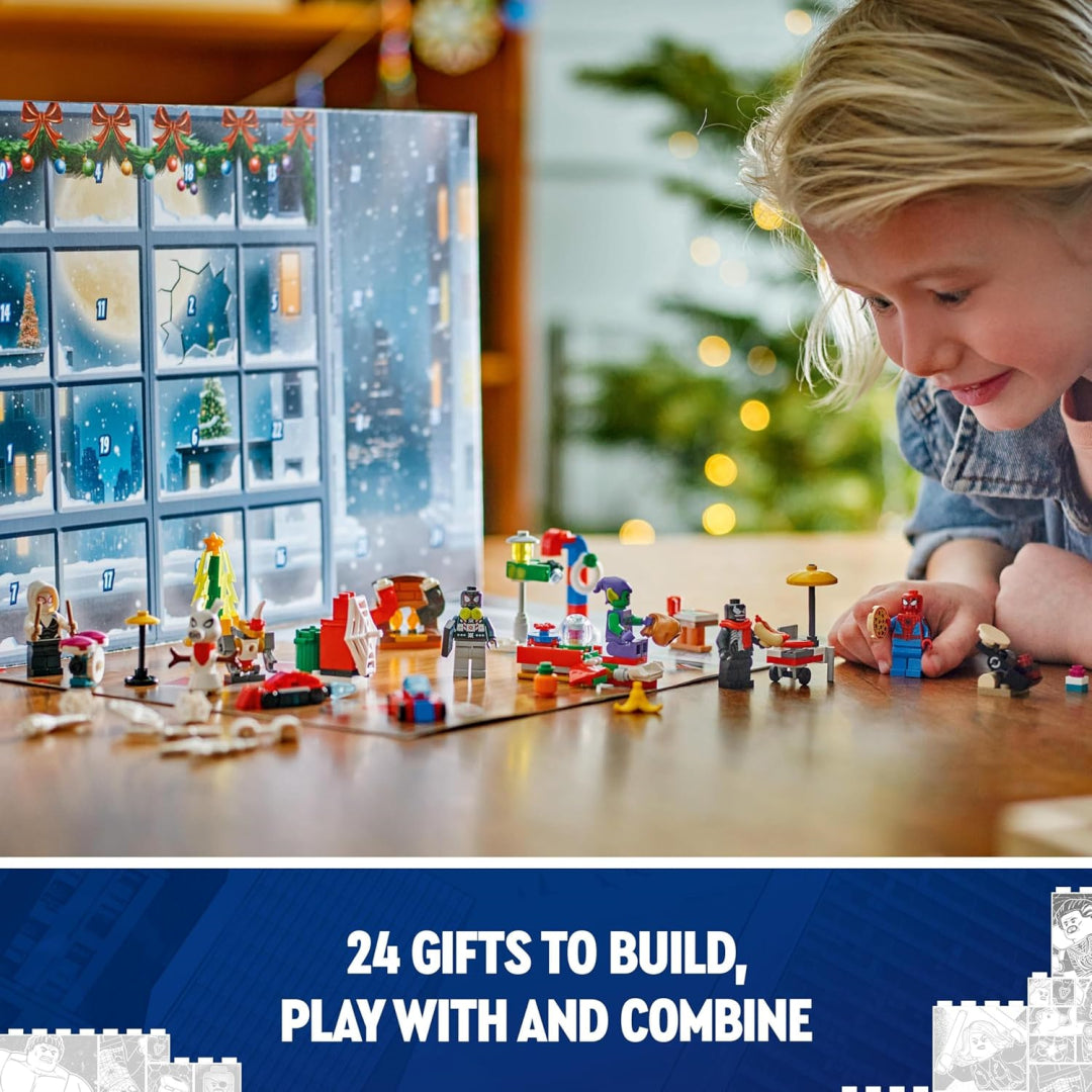 Super Hero-themed children's advent calendar For boys and girls aged seven and above, there is a Lego Spider-Man 2024 Advent Calendar including 24 surprise items every day. Buildable replicas of scenes from the Spider-Man movies, such as Electro's winter tree, a snow Spider-Ham and a hot dog cart. Contains two little vehicle toys, delightful presents, and Lego Marvel minifigures of Spider-Man, Green Goblin, Miles Morales, and Venom. Kids may use the presents in combination to create Super Hero adventures and reenact Spider-Man movie sequences as the big day draws near. The calendar presents may be used with other Lego Marvel construction toy sets (separately available).