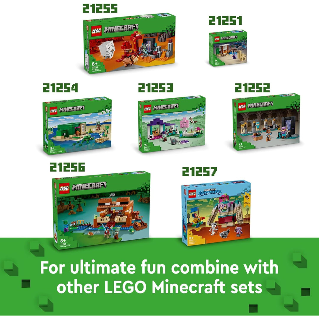This value-packed set includes everything needed for swamp exploration - a Swamp Explorer, zombie, drowned, slime, and three frog figures. The detailed house comes complete with essential Minecraft features like a crafting table, furnace, and chest. They'll love using the fishing rod, boat, and trident while tending to their farm crops and caring for their froggy friends.