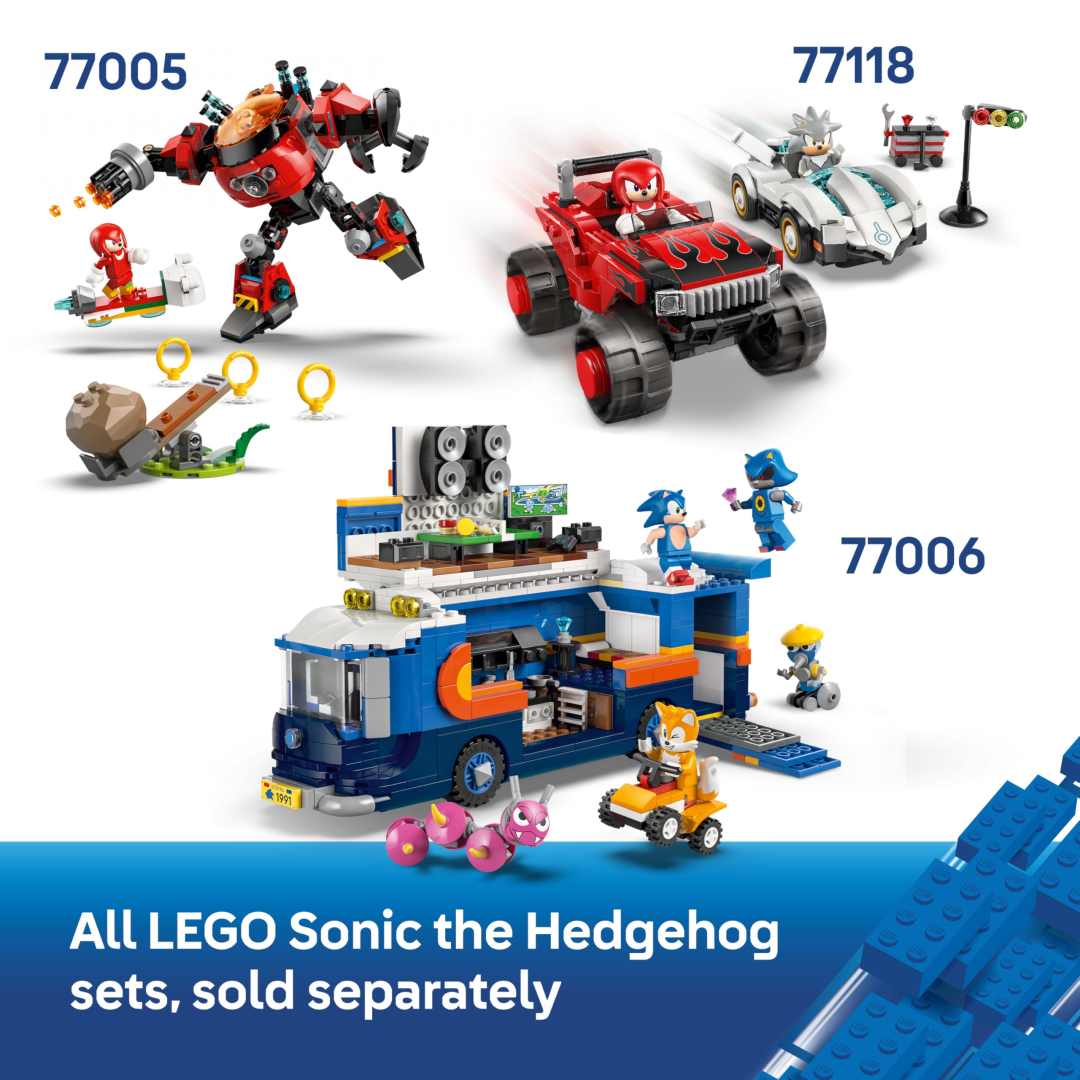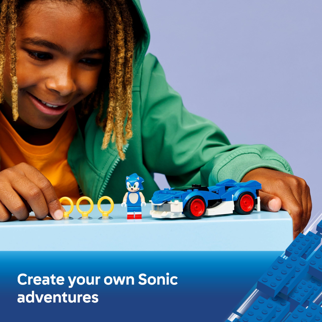 This sleek racer comes dressed in Sonic's signature blue-and-white colour scheme with eye-catching wide, red-rimmed tyres that mean business. Pop open the bonnet to reveal a hidden Chaos Emerald gem, then seat the included Sonic minifigure behind the wheel. With his cheeky facial expression and 3 Gold Sonic Rings ready for action-packed storytelling, your little speedster can recreate their favourite gaming moments or dream up brand new racing adventures.