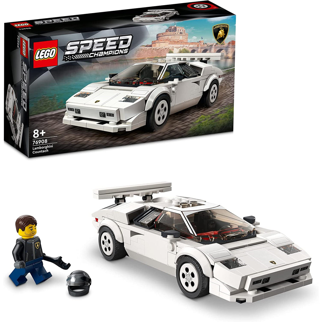 A white Lamborghini Countach replica automobile model is included, along with a branded racing driver minifigure that comes equipped with a crash helmet, wig, and wrench.