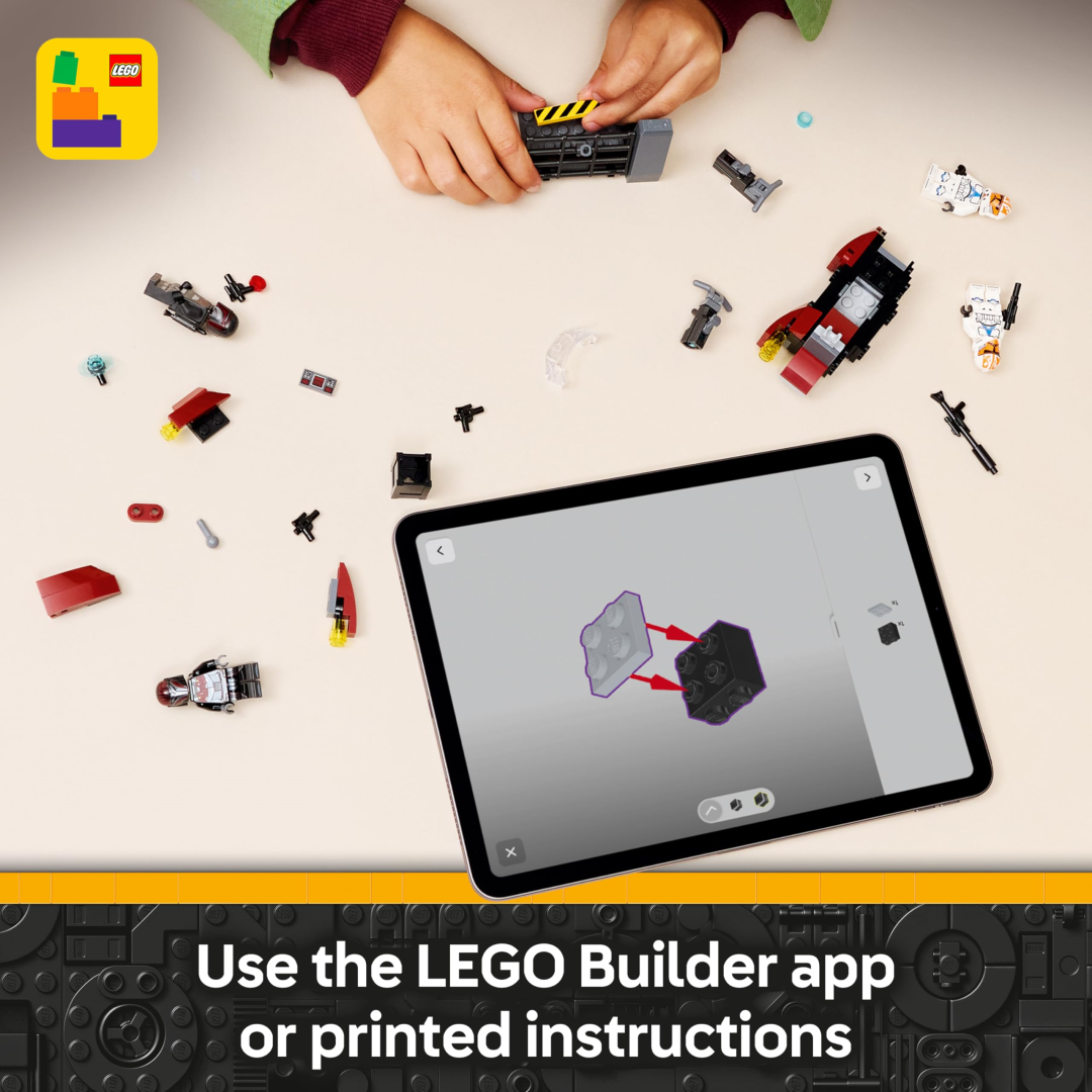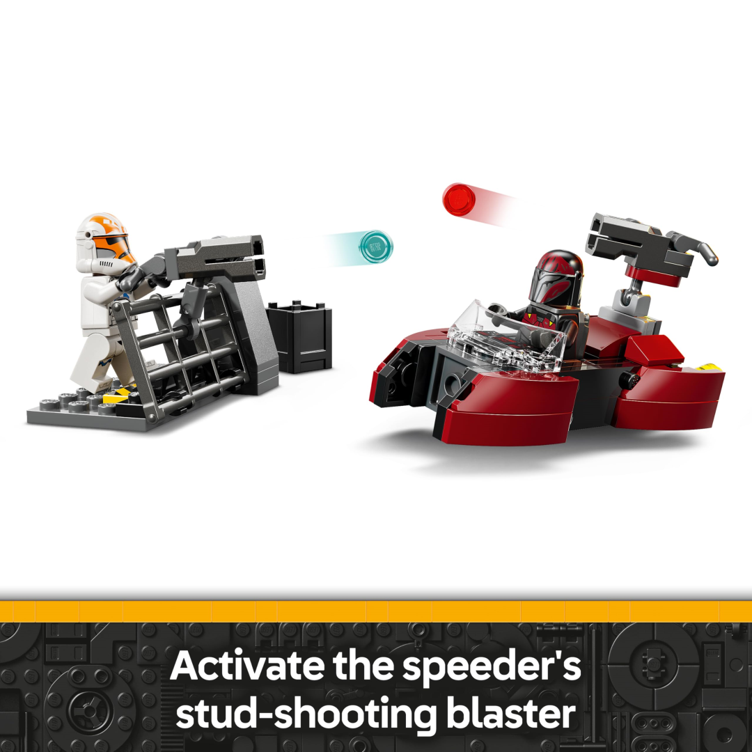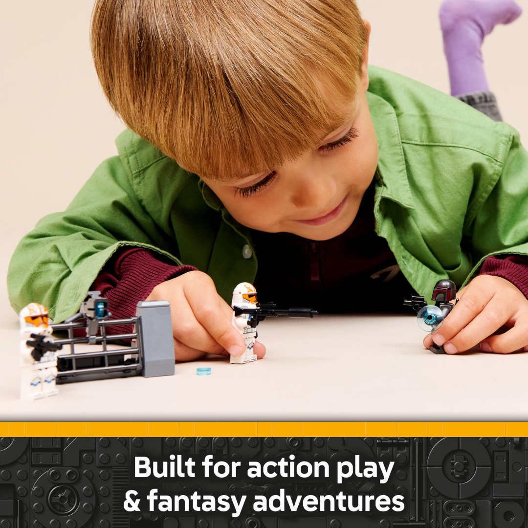 Inside, you'll find two Mandalorian Super Commandos kitted out with jetpacks, three blaster pistols between them, and a speeder bike ready for fast-paced action. Pop one in the driver's seat and position the other at the rear to man the stud-shooting blaster. On the opposing side, two 332nd Clone Troopers come armed with a blaster and blaster rifle, plus a defensive barricade complete with a mounted stud shooter and handy ammo storage. Everything your little ones need to stage epic battles is right here.