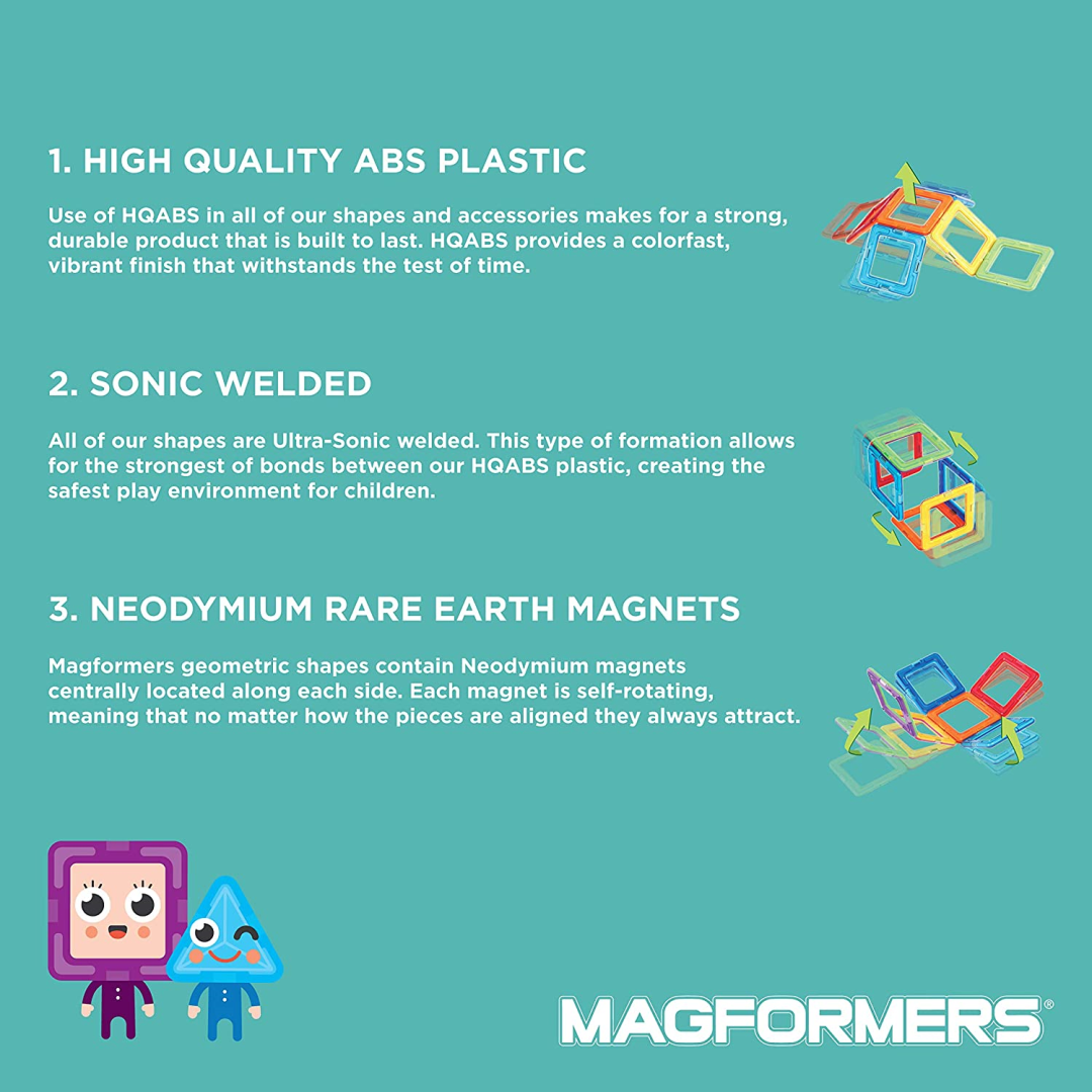 The set includes 12 Magformers magnetic shapes and nine bank-themed accessories, plus a bank manager figure. Built with safety in mind, each piece features securely enclosed neodymium magnets within durable ABS plastic. The clever Rotating Magnets System means pieces always connect perfectly - no frustrating misalignments or rejected connections.