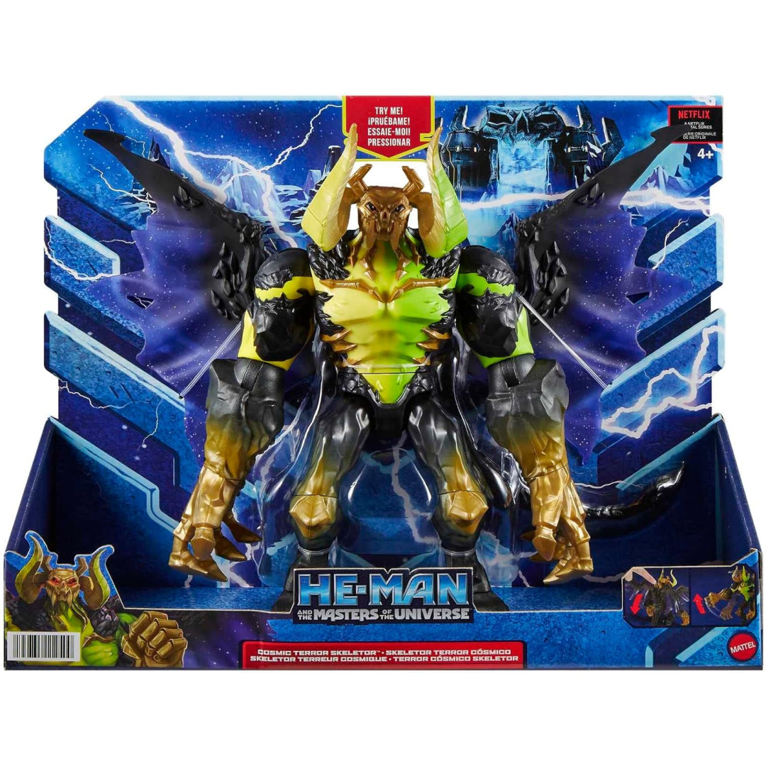 Get ready for epic playtime battles with this massive Masters of the Universe Cosmic Terror Skeletor figure! At a whopping 9.5 inches tall and 8.5 inches wide, this intimidating villain towers over standard figures, making him perfect for both play and display.