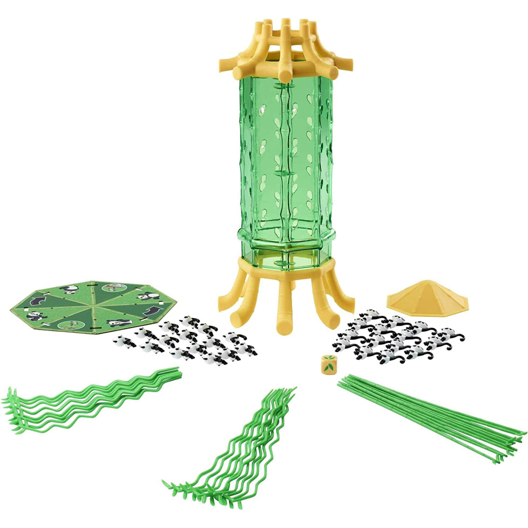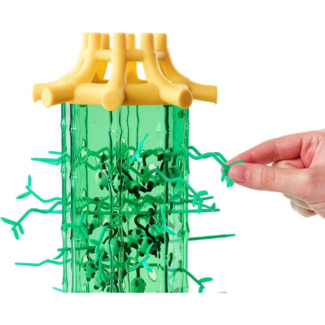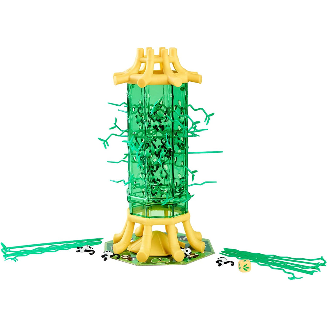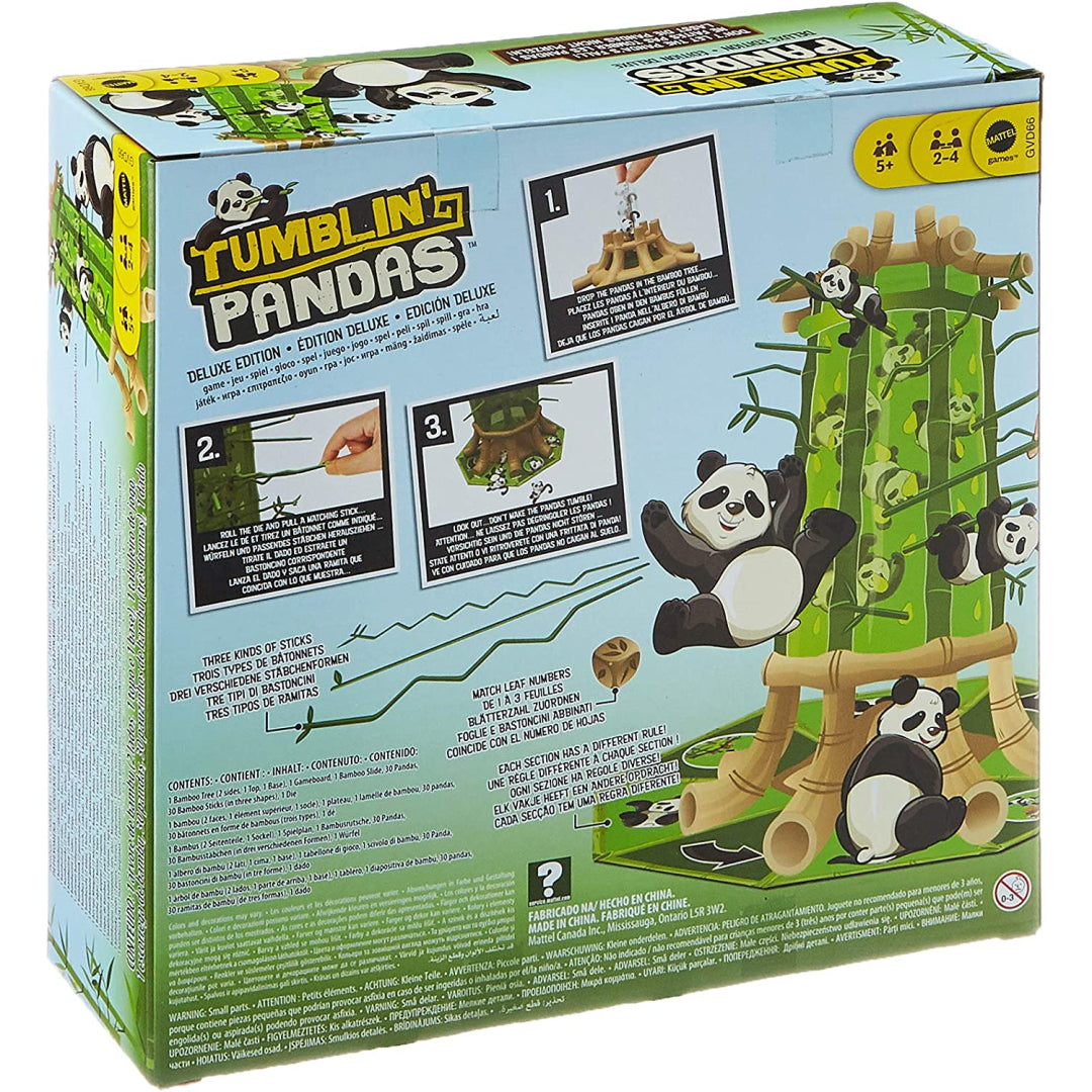 Tumblin' Pandas is a deluxe version of the original arcade game Tumblin' Monkeys, except instead of monkeys, it has pandas. The pagoda-like structure that is patterned after bamboo is home to the distinctive black-and-white Pandas figurines. Playing the game using the bamboo sticks, which are especially bendy, is more difficult. The bamboo dice allows participants to choose which stick they should focus their efforts on removing. A base that descends below the tower adds unpredictable results based on where the pandas fall; for example, they may land back in the tower, on another player's turn, or be removed from the game entirely. A wonderful present idea for anybody above the age of 5 who has a soft spot in their heart for animals. There may be some variety in the colours and embellishments.